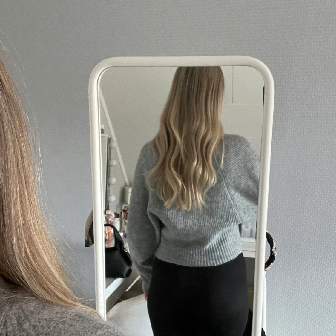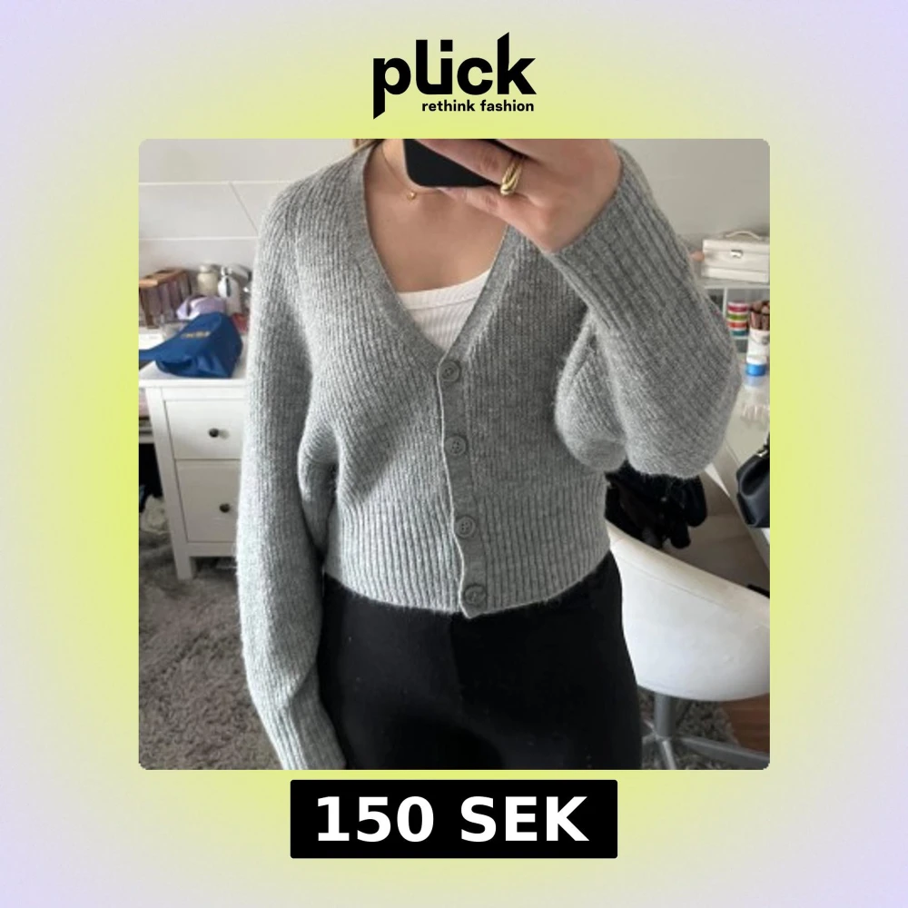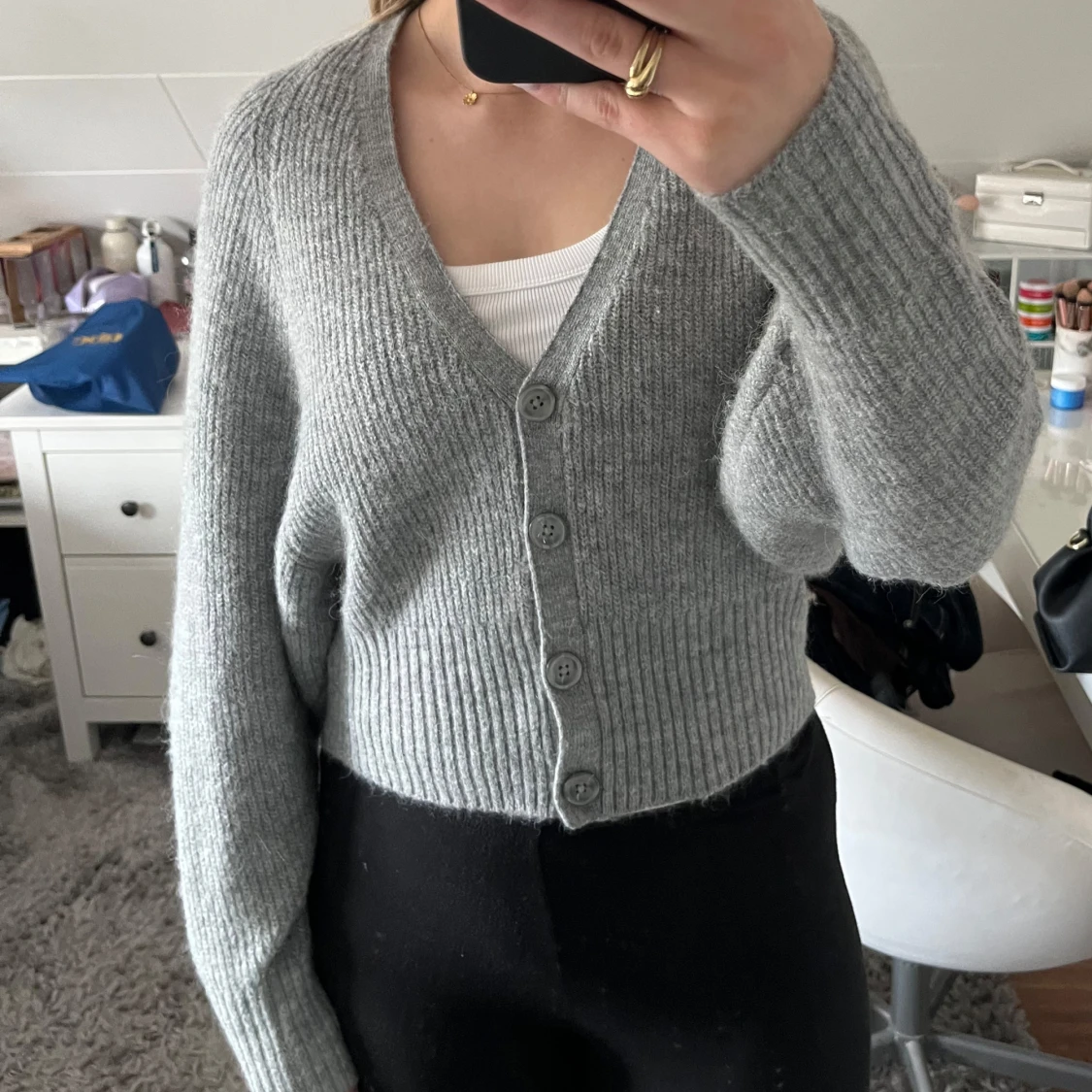 Säljer en stilren grå kofta med ribbad struktur och knappar framtill. Koftan är figursydd med balongärmar.