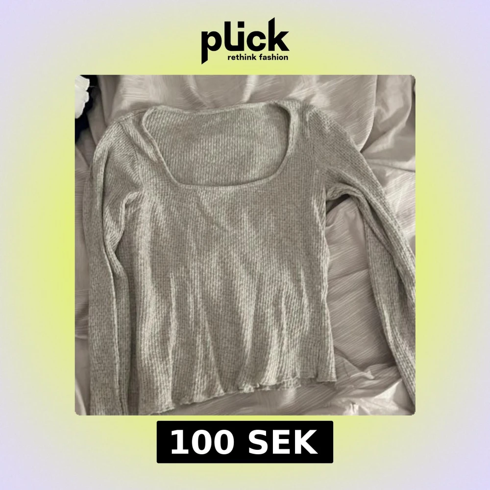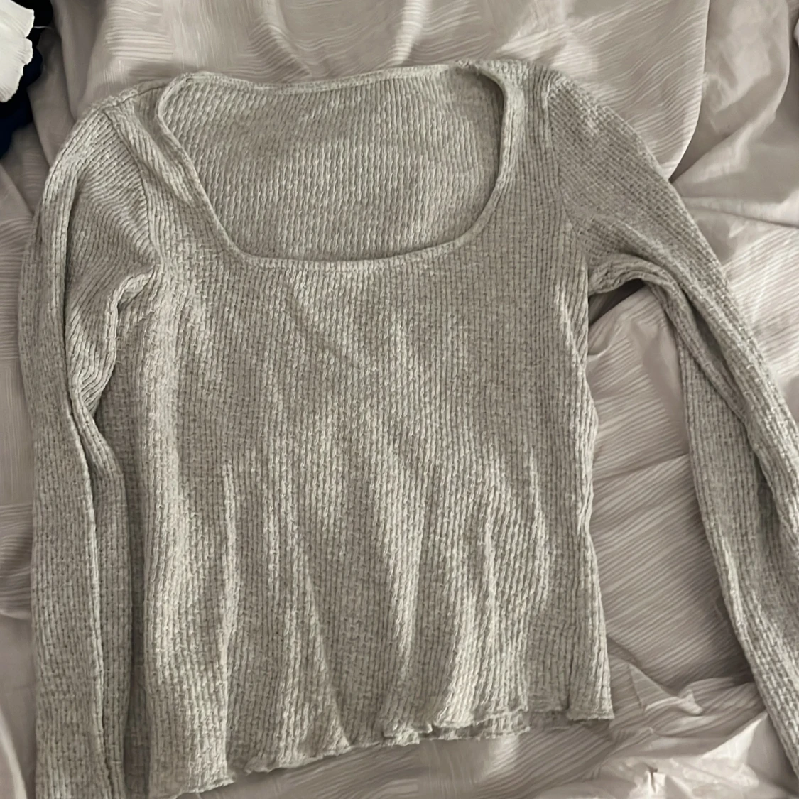 Säljer en stilren grå ribbad topp med långa ärmar och fyrkantig halsringning. Perfekt för lager-på-lager eller som den är. Passar till både jeans och kjol!