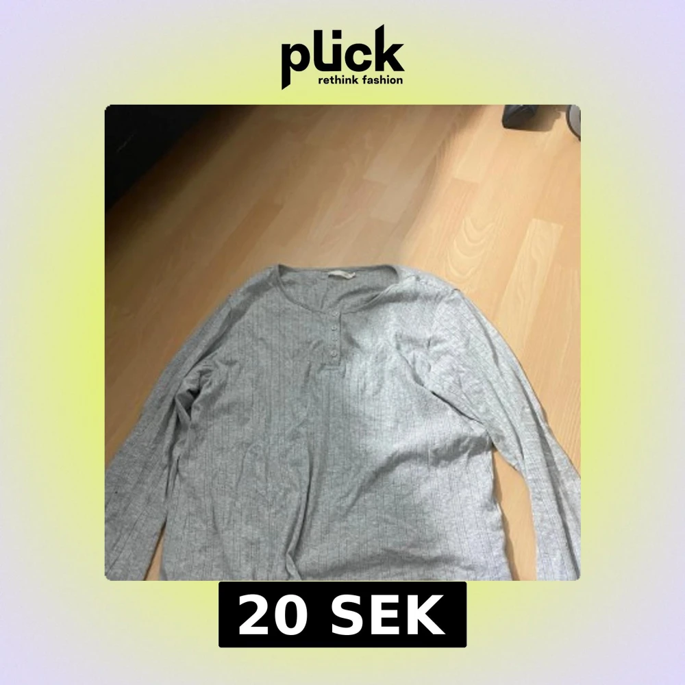 Säljer en grå långärmad tröja från 157 med diskret ribbat mönster och knappar vid halsringningen. Perfekt basplagg med enkel och stilren design.