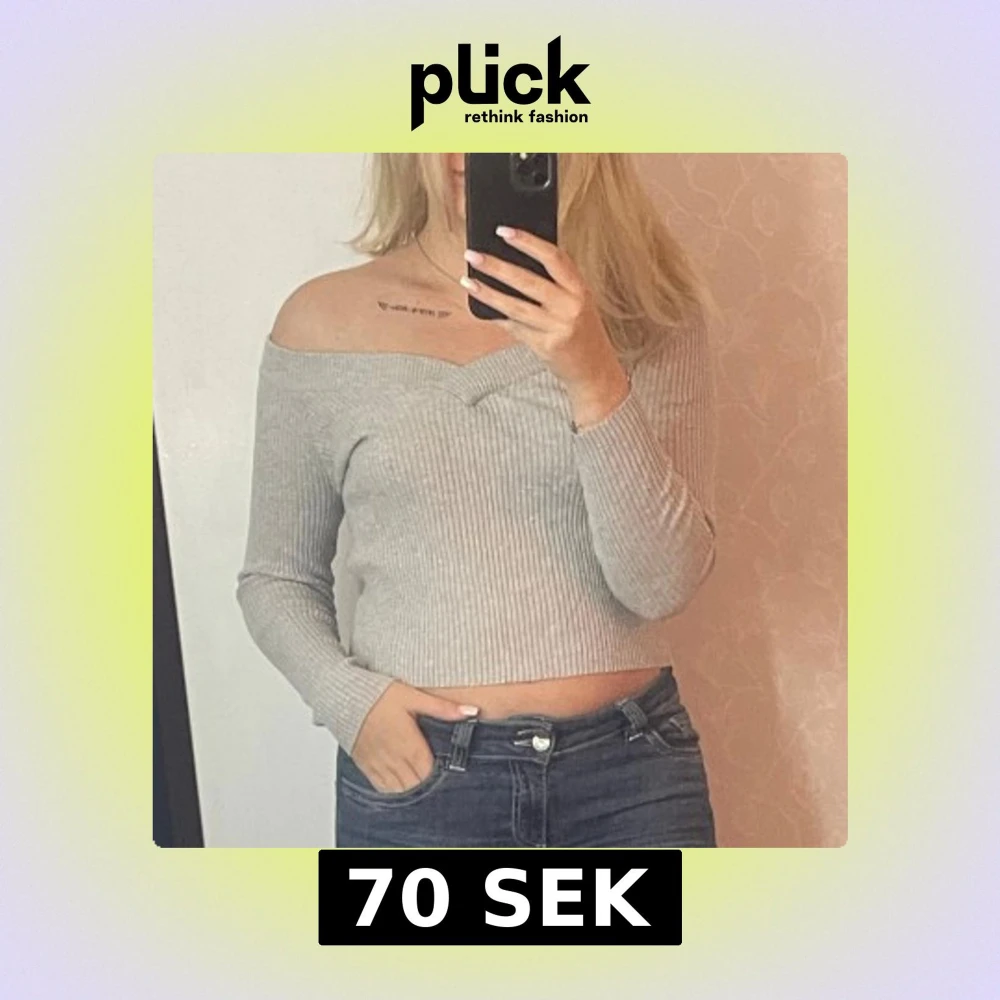 Snygg grå ribbad offshoulder tröja med lång ärm och croppad passform.