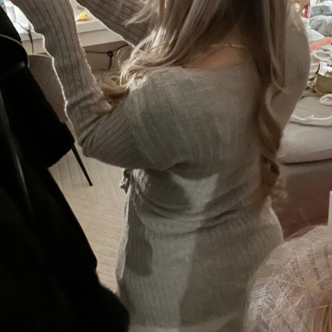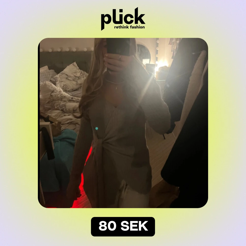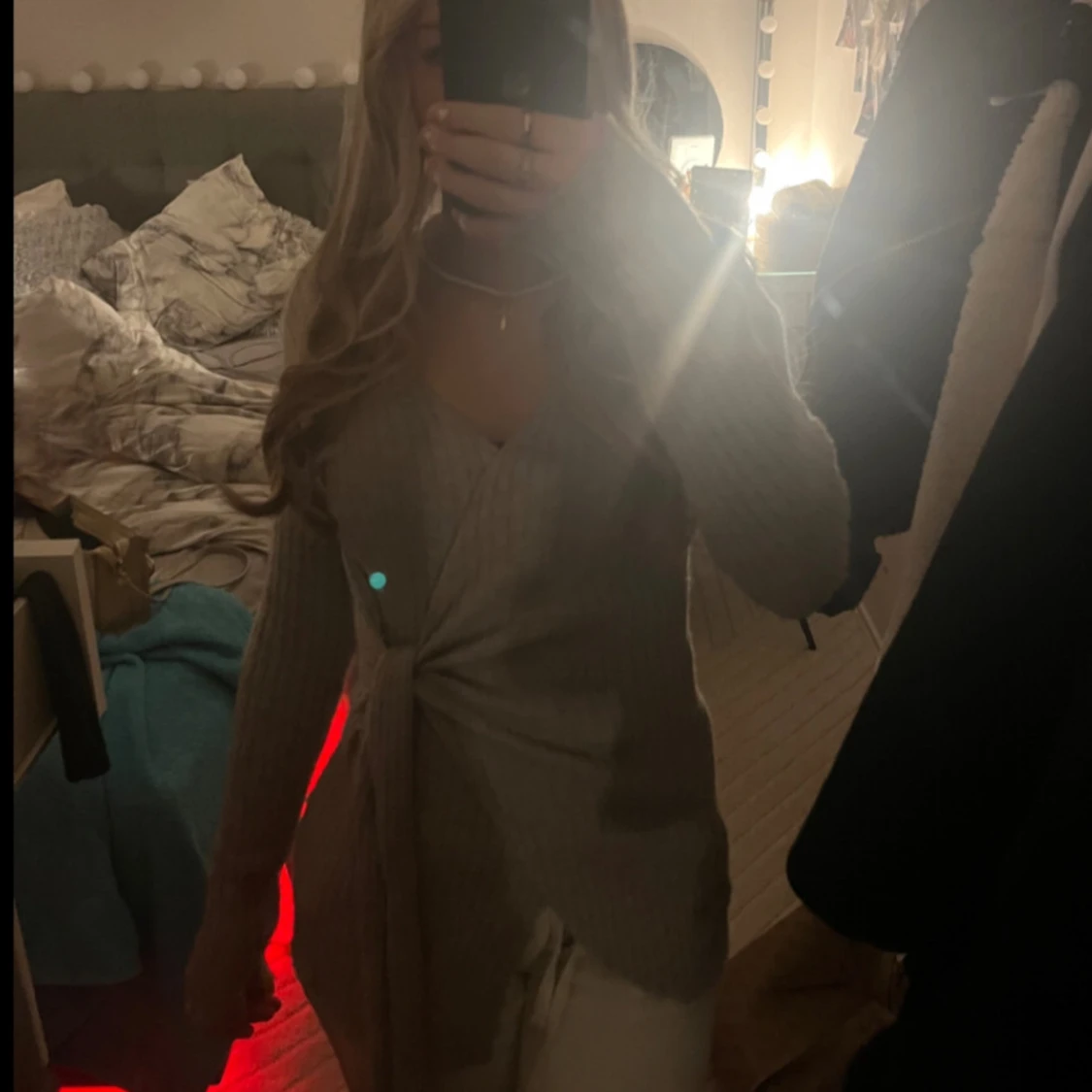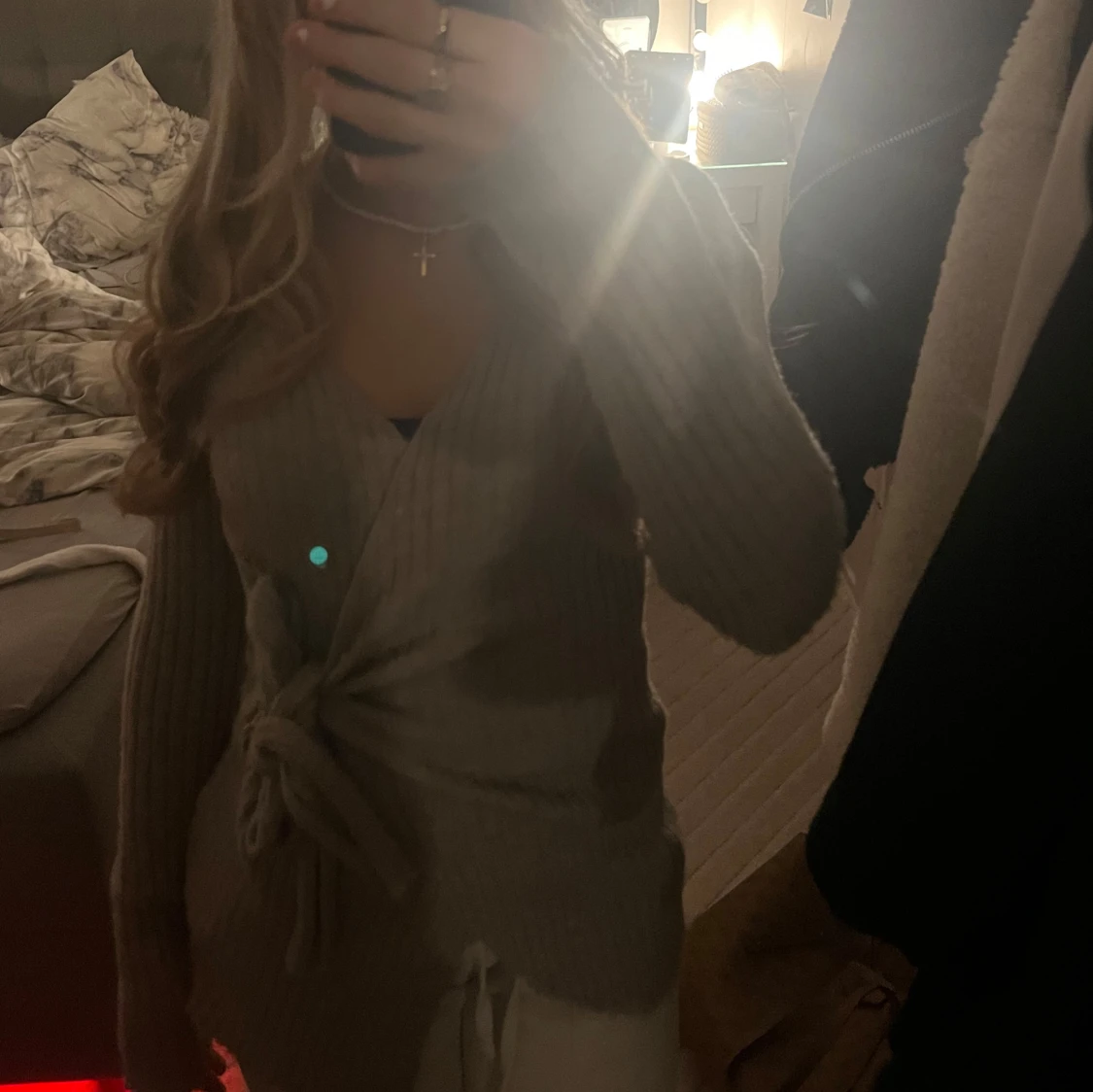 Säljer en superfin grå ribbad omlottkofta med knytning i midjan. Den har långa ärmar och en mysig passform, perfekt nu till hösten