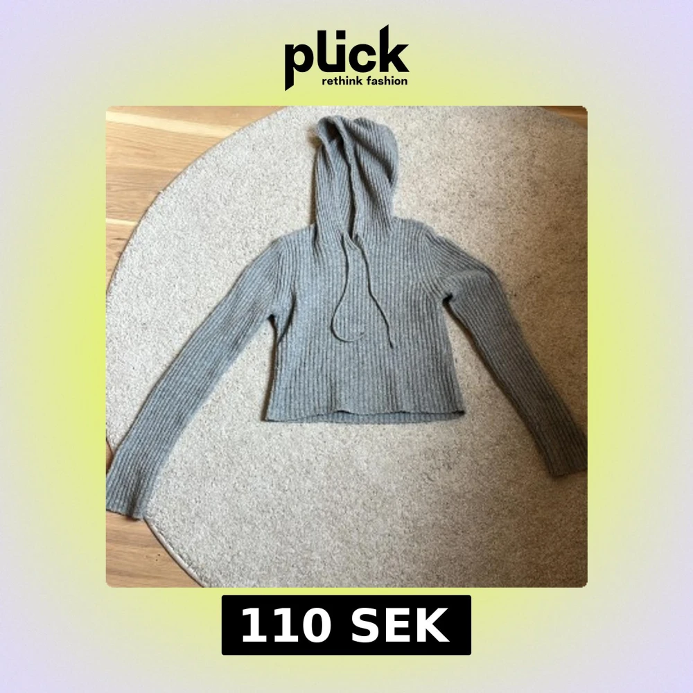 Säljer en grå ribbad stickad hoodie med långa ärmar och huva med dragsko. Tröjan har en mjuk och skön känsla, perfekt för kyligare dagar.