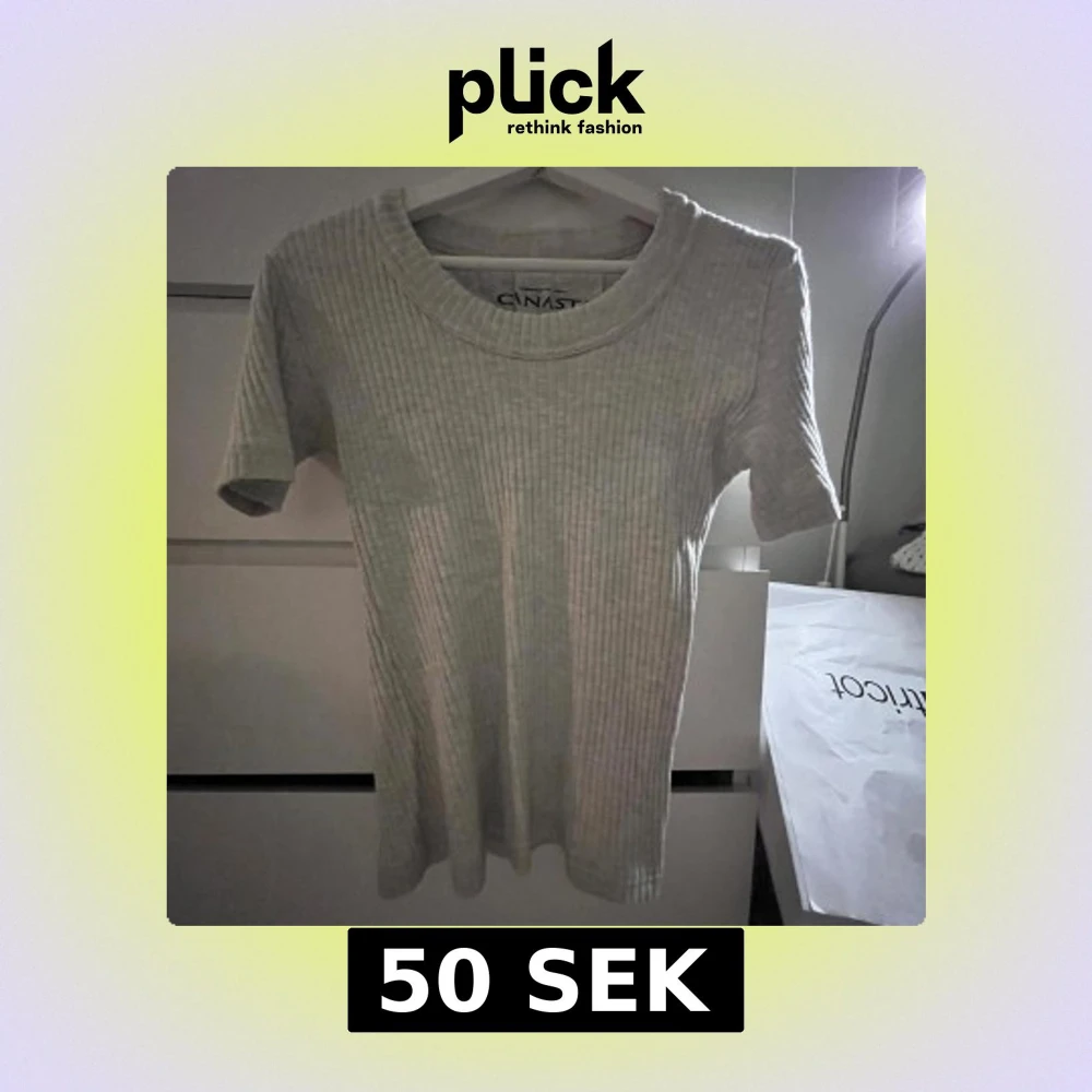Säljer en stilren grå ribbad t-shirt från Canast. Perfekt för en avslappnad look med korta ärmar och rund halsringning. Passar bra till både jeans och kjol.