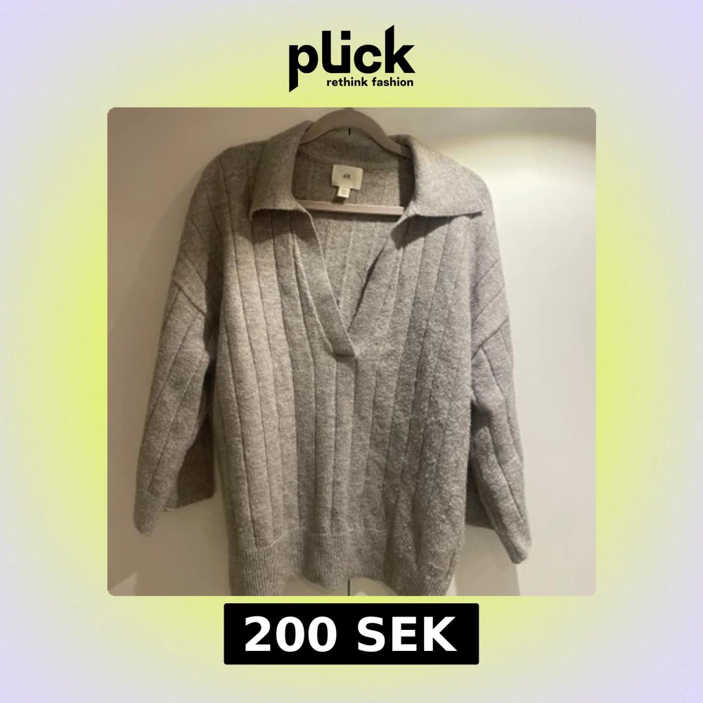 Säljer en stilren grå ribbad tröja från H&M med en djup v-ringning och krage. Tröjan har trekvartsärmarär och en avslappnad passform, perfekt för kyligare dagar. Knappt använd