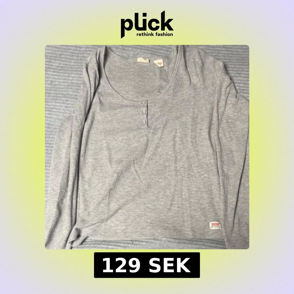 Säljer en stilren grå ribbad tröja från Levi's med rund hals och tre knappar framtill. Perfekt för en avslappnad look.