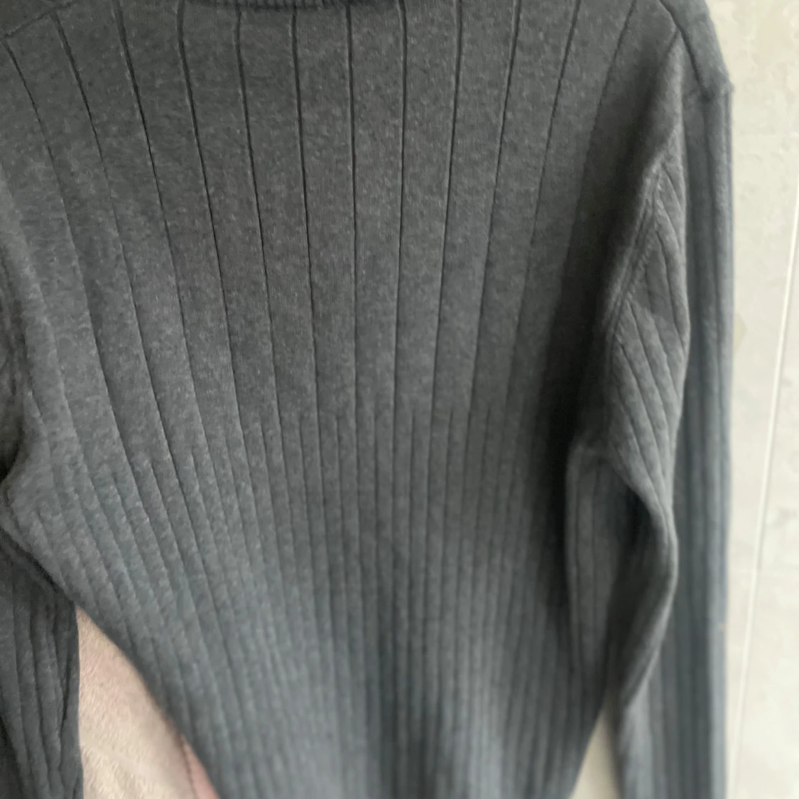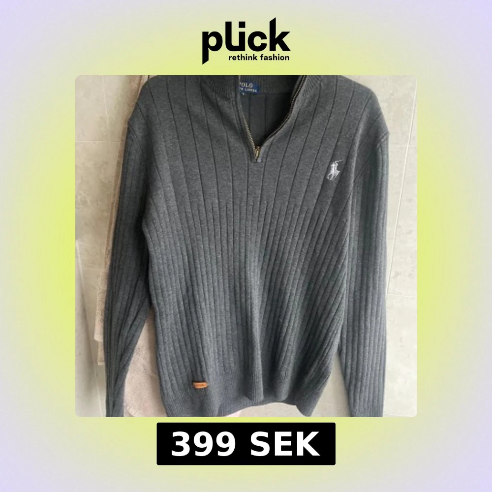Snygg grå ribbstickad tröja från Polo Ralph Lauren med halv dragkedja och broderad logga på bröstet. Tröjan har hög krage och långa ärmar, perfekt för lager-på-lager under kyliga dagar.