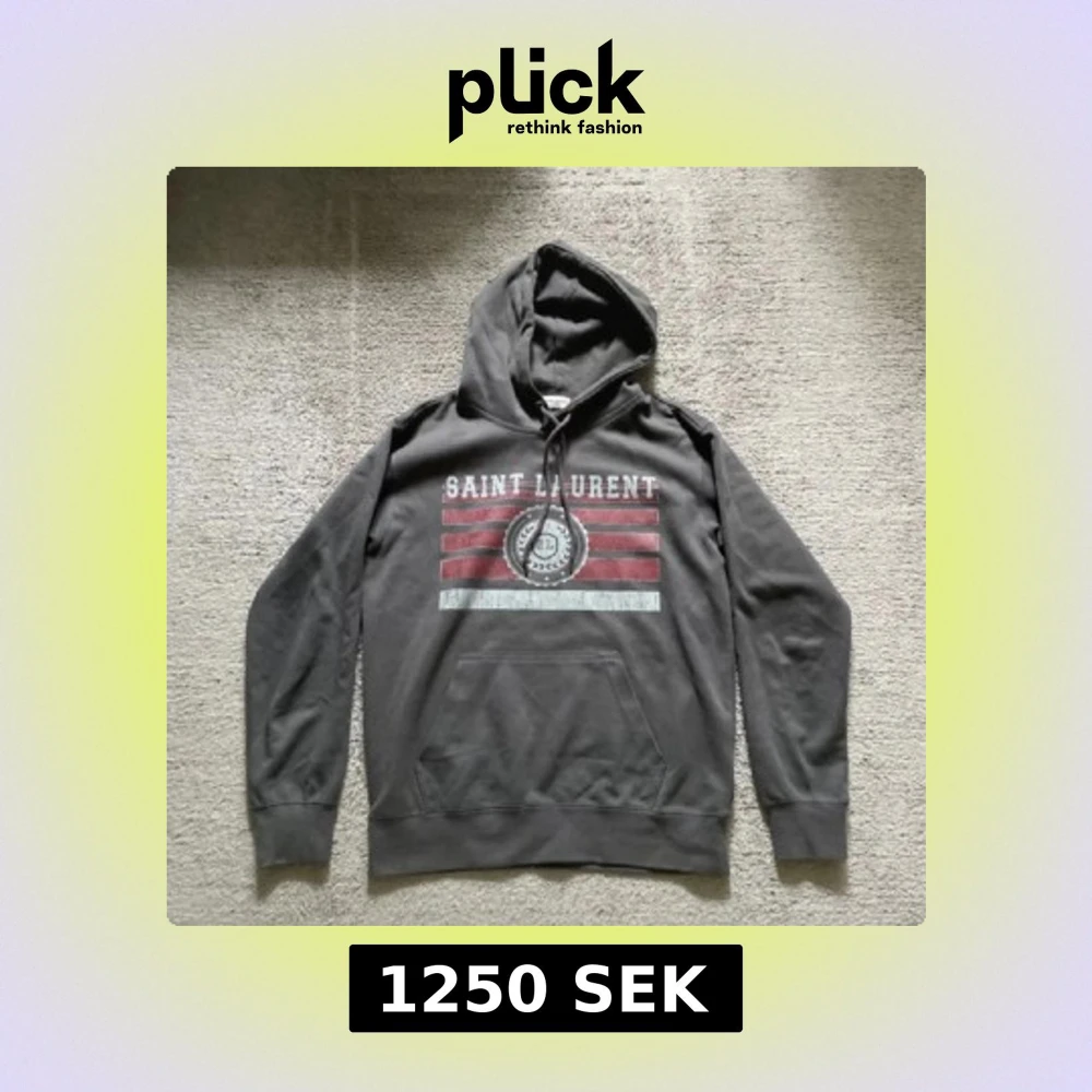 Säljer en grå hoodie från Saint Laurent med huva och snörning. Framsidan har ett coolt tryck med röda och vita ränder samt SL-emblem. Klassisk känguruficka och ribbade muddar. Perfekt för dig som gillar streetstyle och designerplagg. Står M men passar mer S.