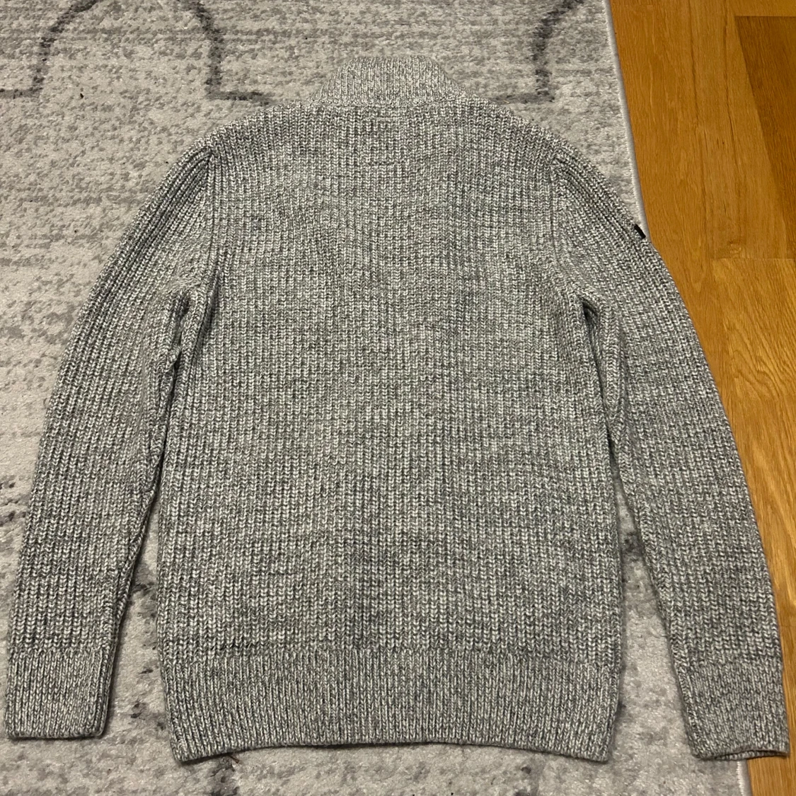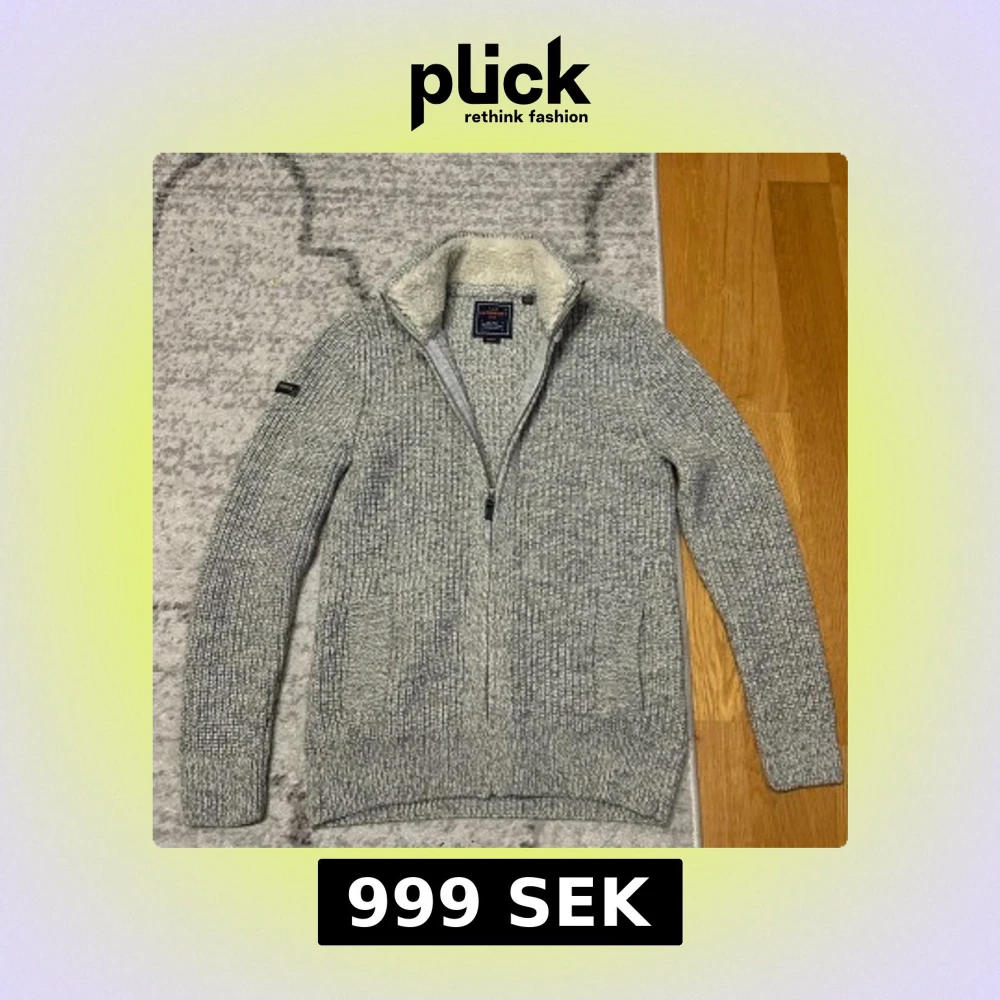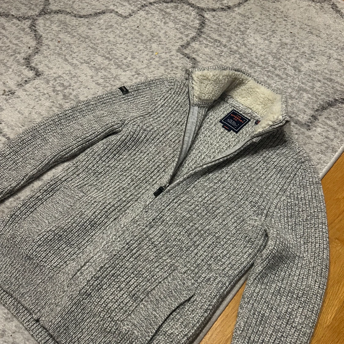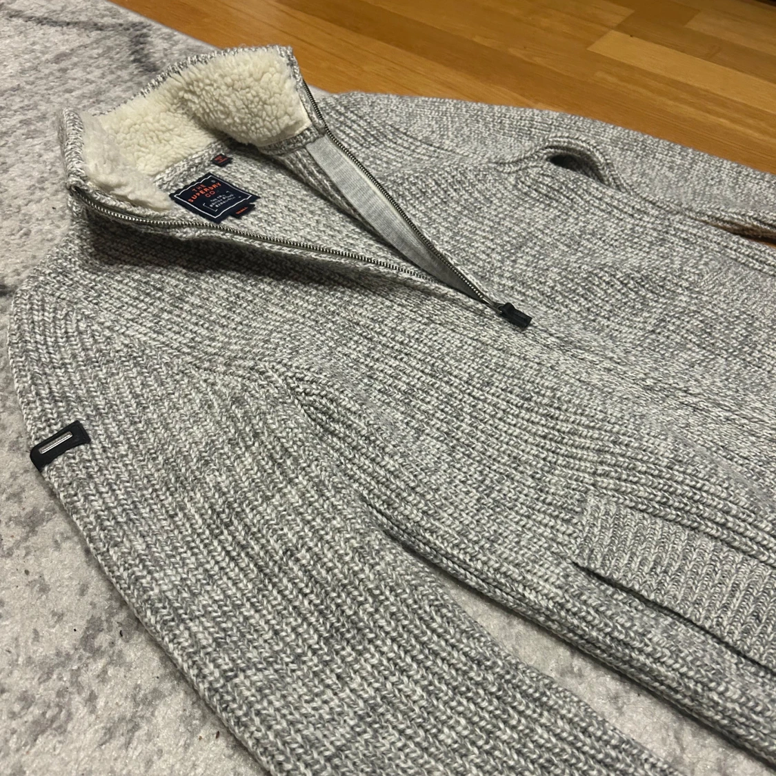 Säljer en gråmelerad stickad kofta från Superdry med mysigt teddyfoder i kragen. Koftan har hel dragkedja, två fickor fram och ribbade muddar. Perfekt för kyliga dagar och riktigt skön att ha på sig.