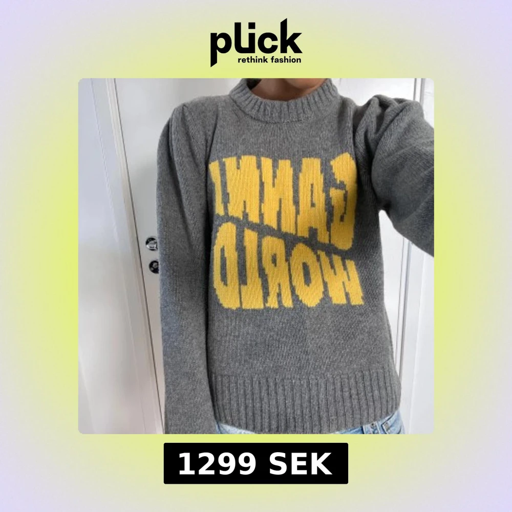 Säljer en grå stickad tröja från Ganni med stort gult 'GANNI WORLD'-tryck på bröstet. Tröjan har ribbad hals, muddar och nederkant samt långa ärmar med lätt puff vid axlarna. Perfekt för dig som gillar statement-plagg och coola detaljer.