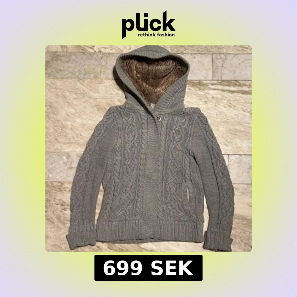 Mysig grå stickad cardigan med kabelstickat mönster och mjukt foder i luvan. Perfekt för kyliga dagar med sin varma och bekväma design. Långa ärmar och ribbade muddar ger en skön passform.