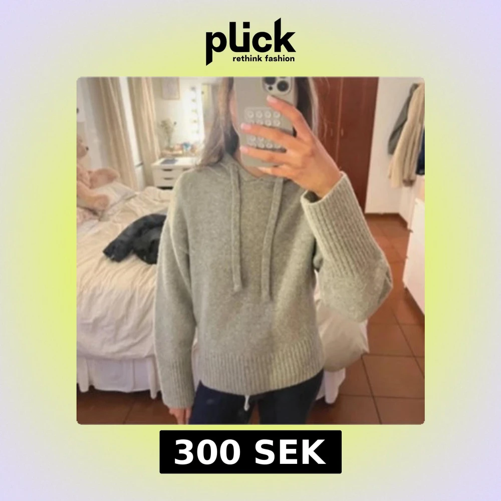 Mysig grå stickad hoodie med huva och snörning. Tröjan har långa ärmar och breda ribbade muddar vid ärmslut och nederkant. Skriv för funderingar eller fler bilder