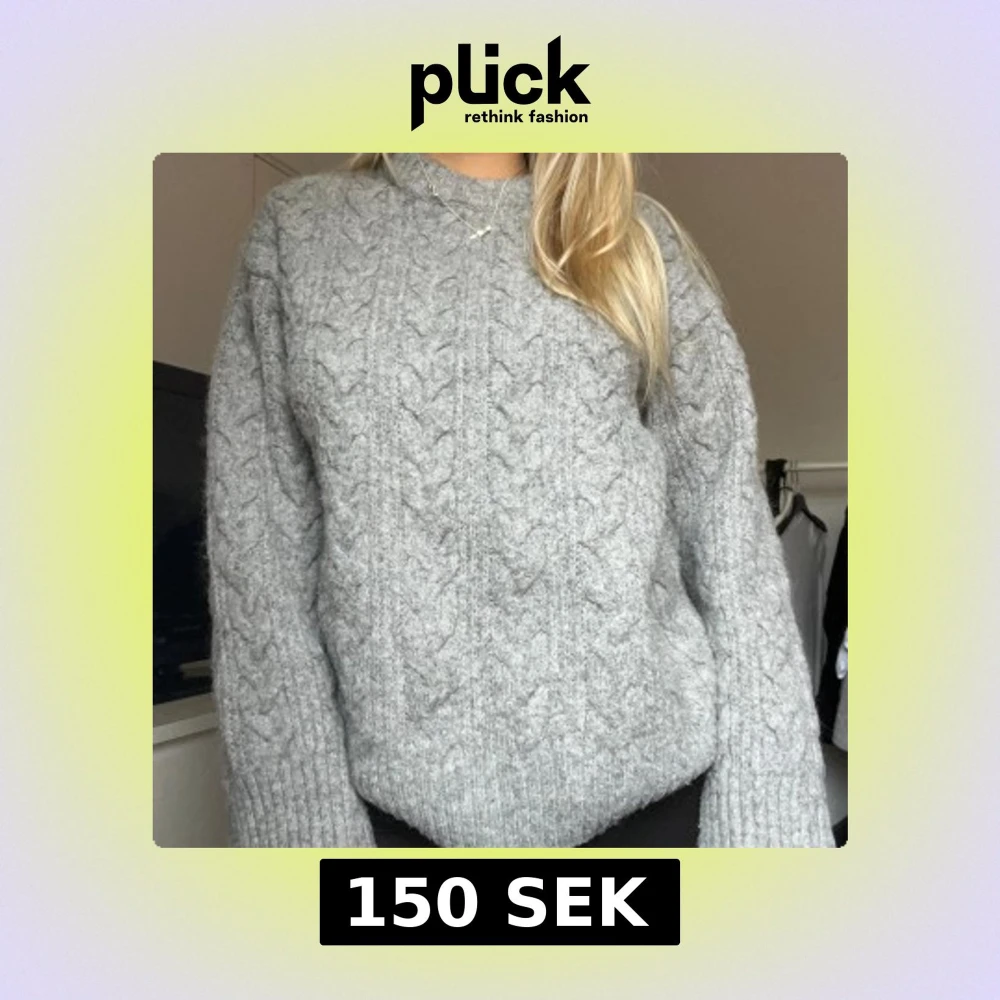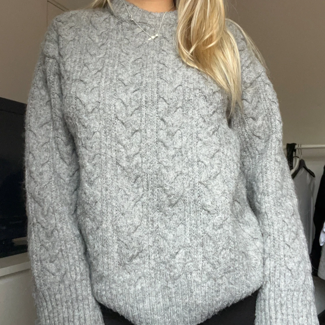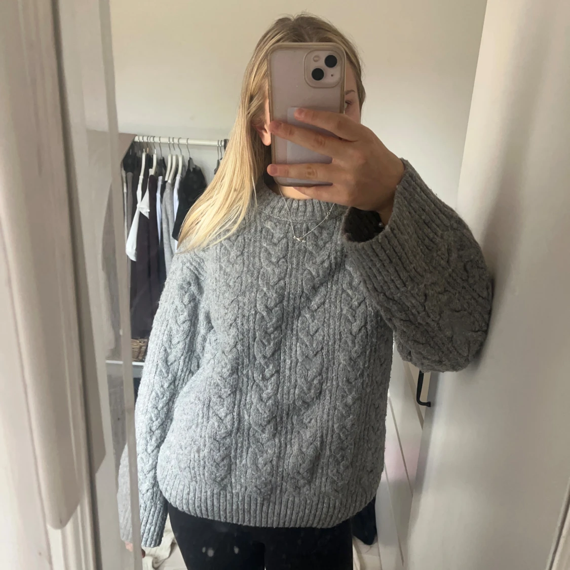 Mysig grå stickad tröja med kabelstickat mönster och ribbade muddar. Tröjan har en relaxed fit och höga, långa ärmar. Perfekt för kyliga dagar och enkel att styla med jeans eller leggings. Sitter oversized storlek XS men passar S