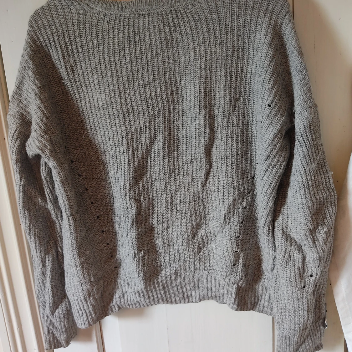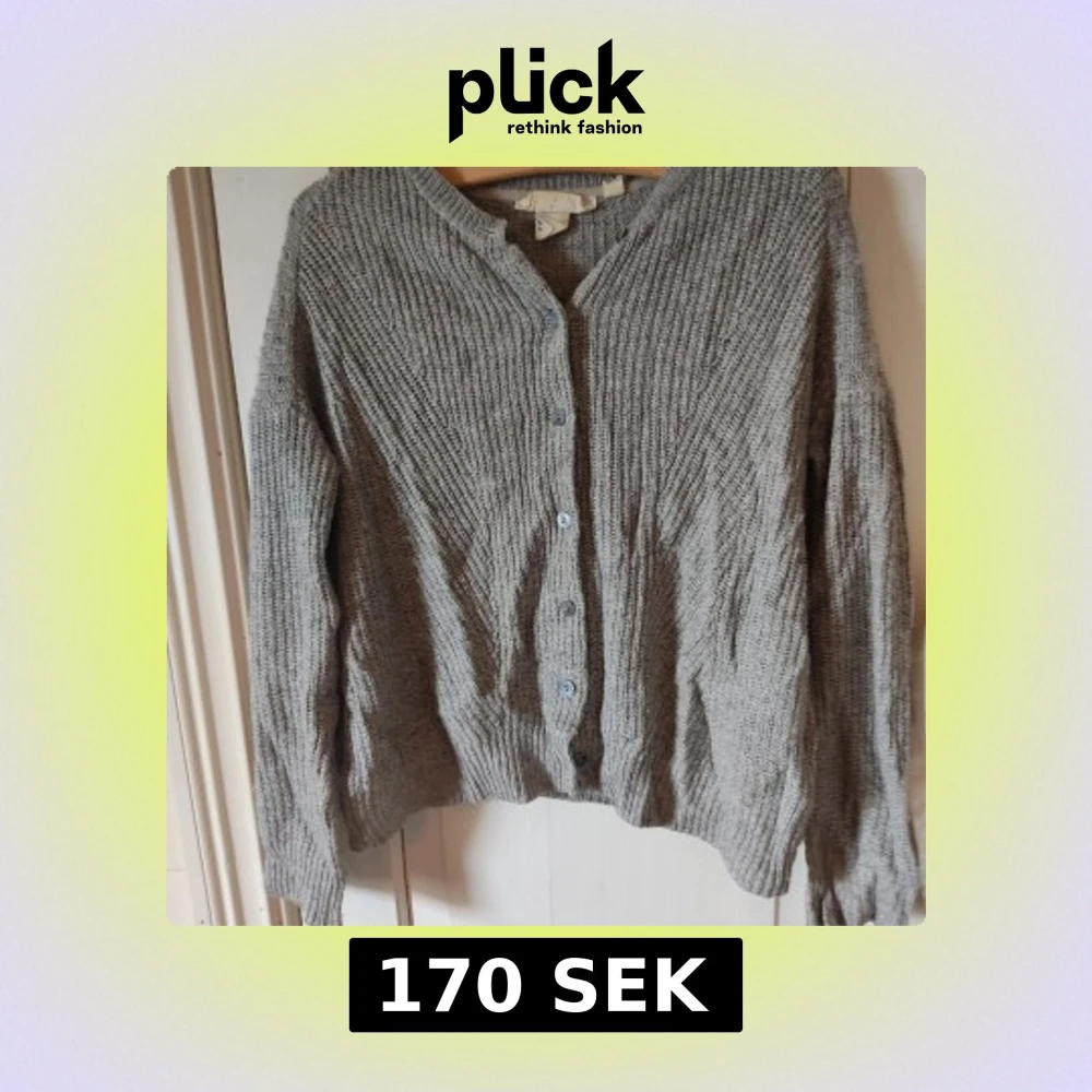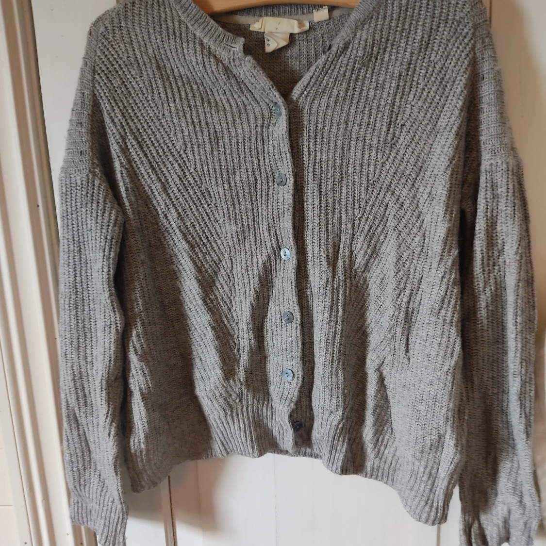 En mysig grå stickad kofta med knappar. Den är väldigt bra att ha när det är kallt ute och man behöver hålla sig varm.