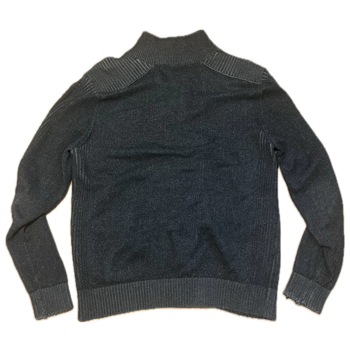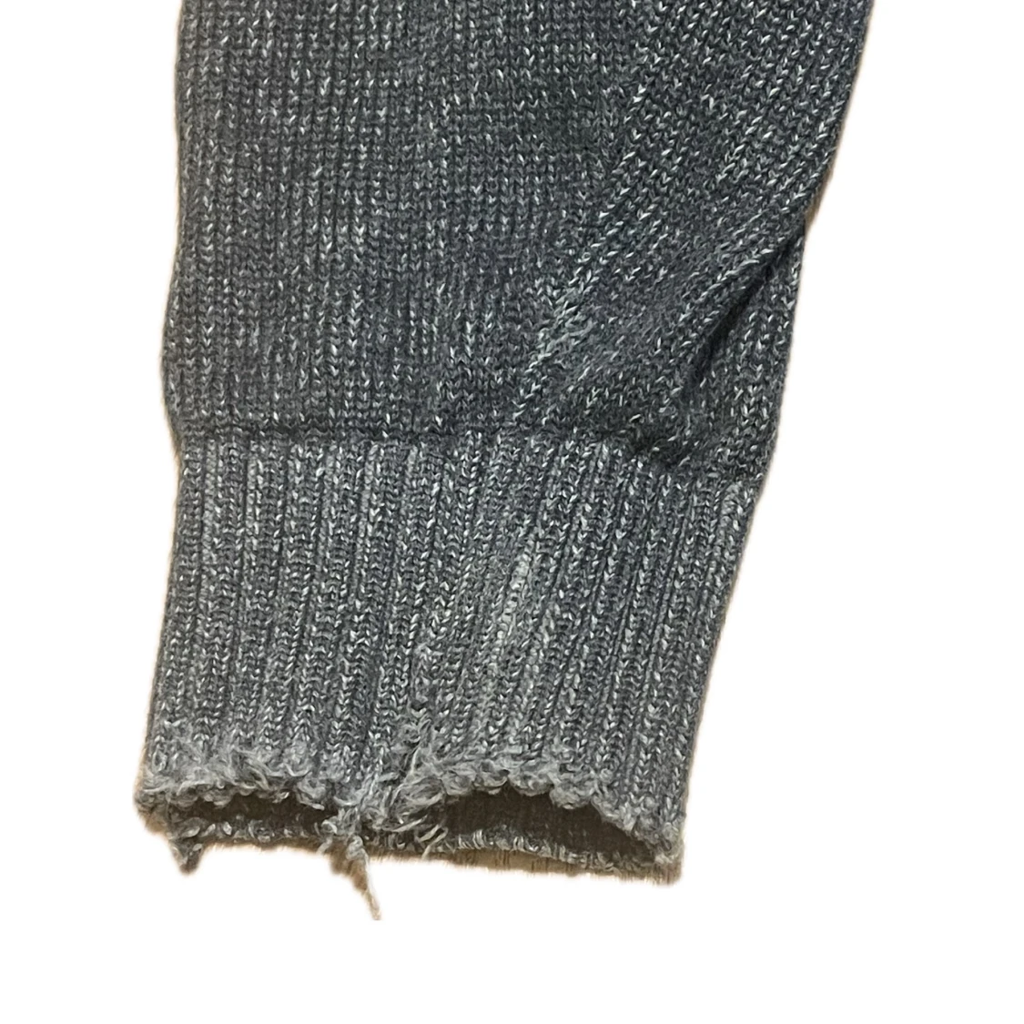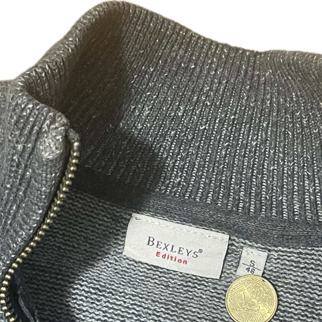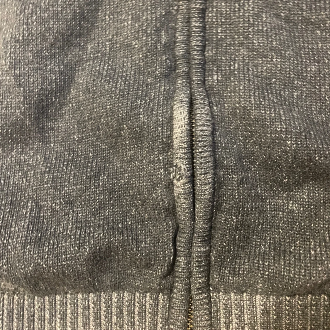 Säljer en mörgrå stickad full-zip kofta från Bexleys. Storleken är S och skicket är helt okej med tanke på slitage i ärmar och öppning i tröjan samt vid dragkedjan.