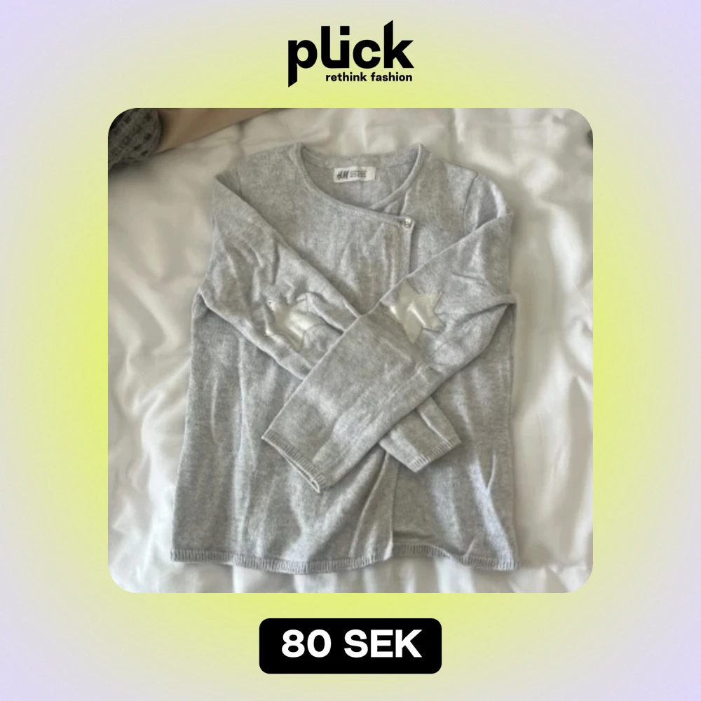 Säljer en mysig grå stickad kofta från H&M. Den har långa ärmar och en fin silverstjärna som detalj på armbågarna. Koftan har en knapp framtill för att hålla den stängd. Perfekt för höst och vinter!