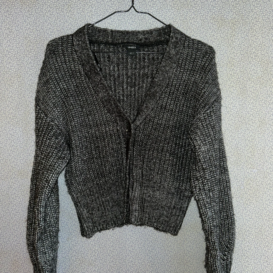Säljer en mysig grå stickad kofta från Lindex. Koftan har en v-ringad design och långa ärmar, perfekt för kyliga dagar. Den är ribbad och har en stilren look som passar till många olika outfits. Perfekt för höst och vinter!