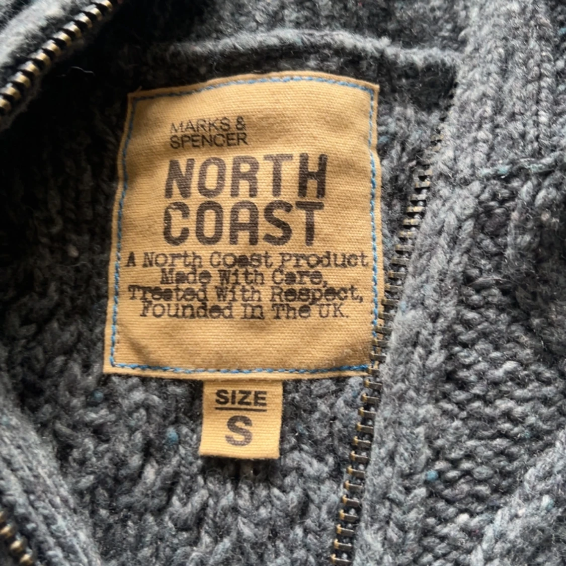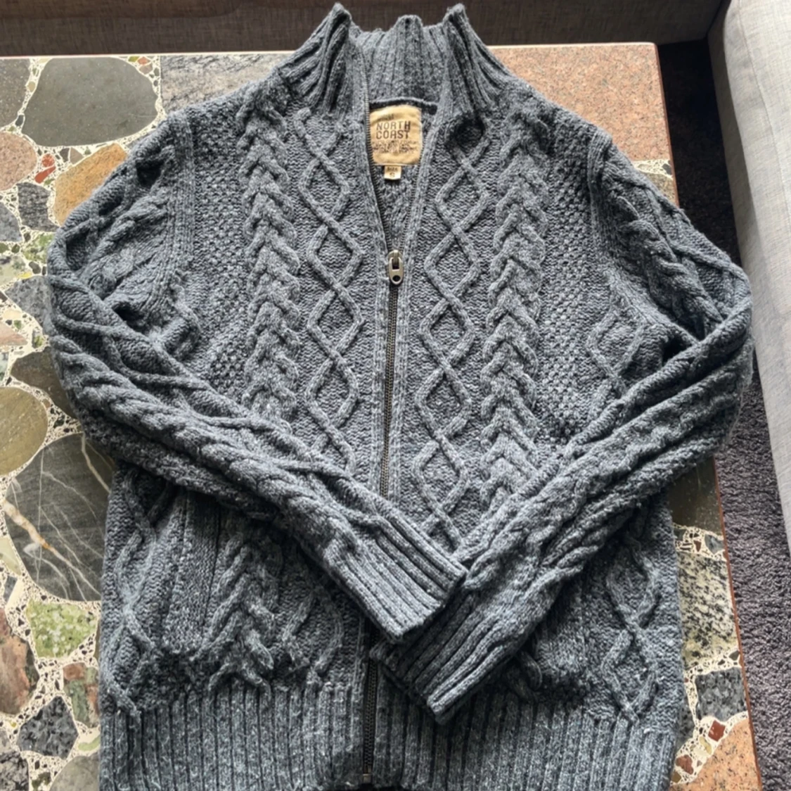 Mysig grå stickad kofta från North Coast med grovt kabelstickat mönster och dragkedja framtill. Hög krage och ribbade muddar ger en snygg och avslappnad look. Perfekt för lager-på-lager under kyliga dagar.
