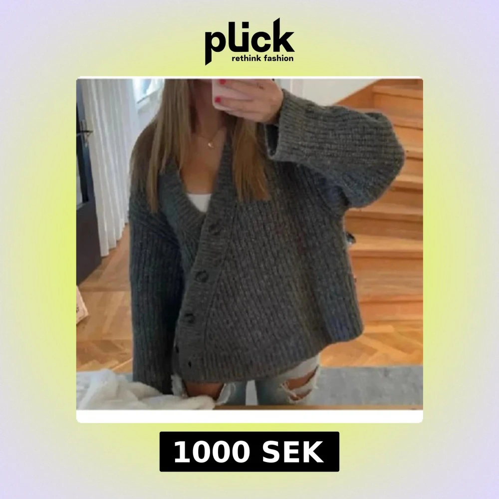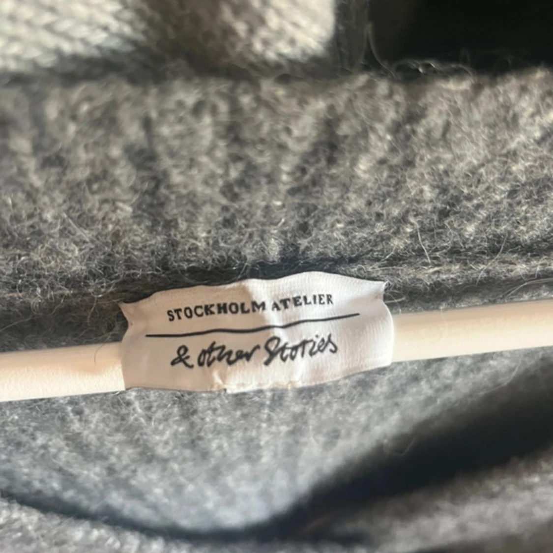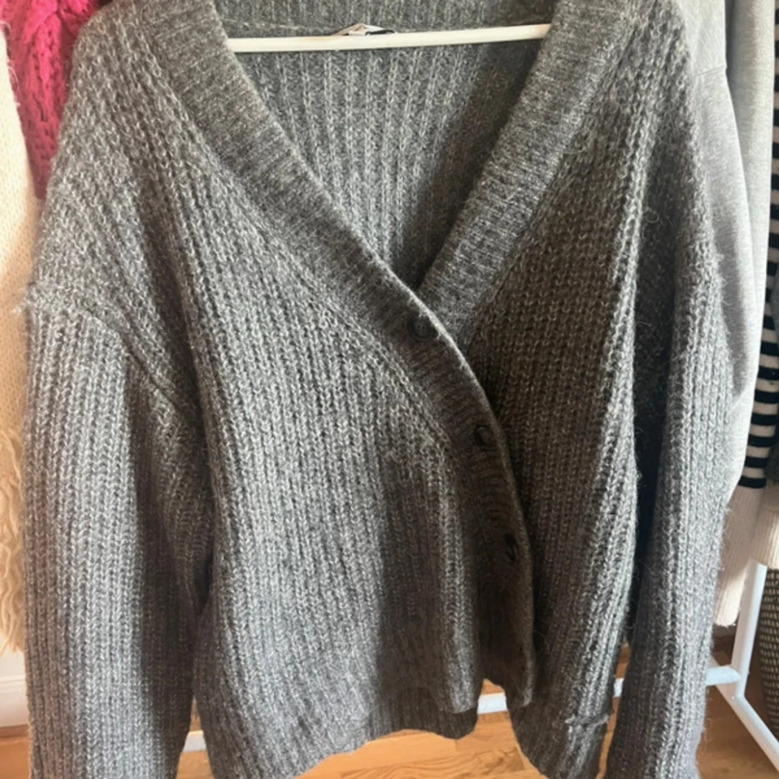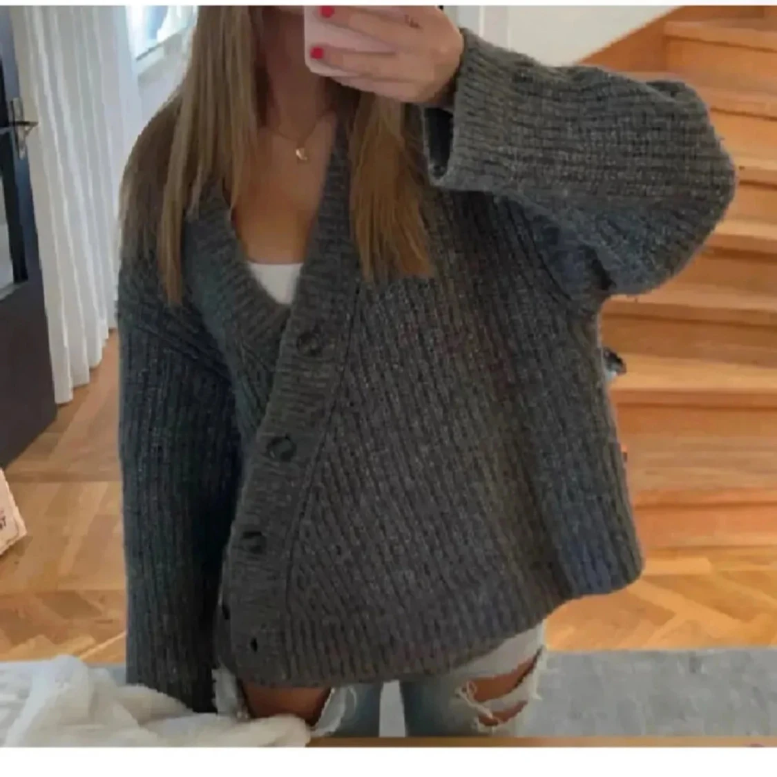 Mysig grå stickad kofta från & Other Stories med v-ringning och knappar framtill. Koftan har en loose passform och långa ärmar, perfekt för lager-på-lager. Ribbstickad struktur som ger en cool och avslappnad vibe.