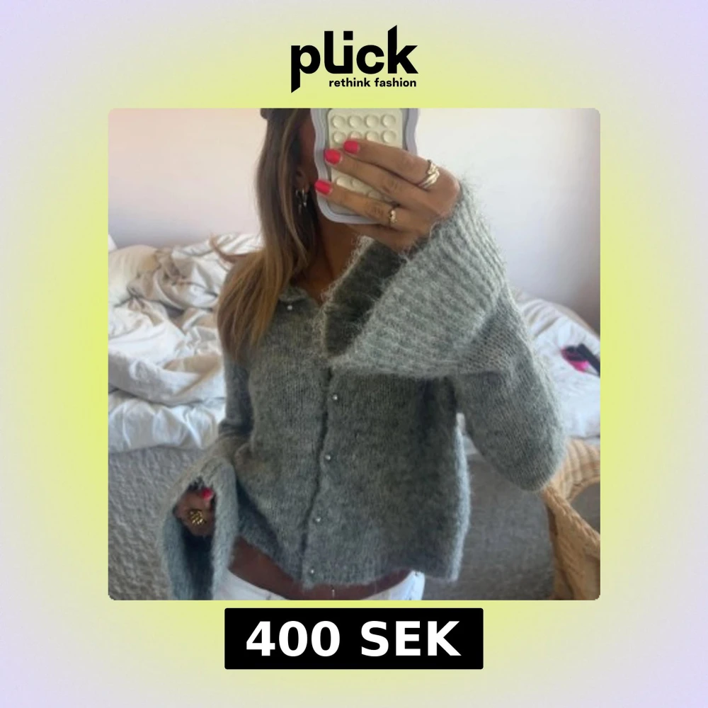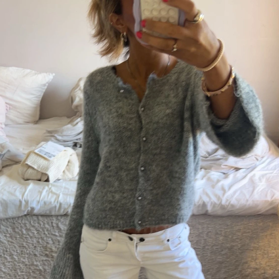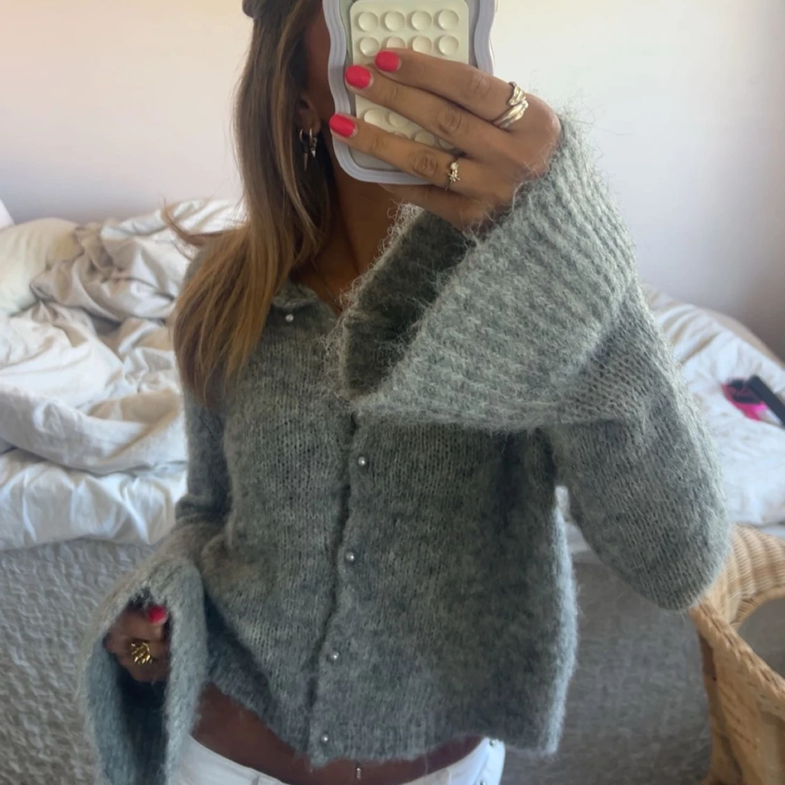 Supermysig grå stickad kofta med vida ärmar och pärlknappar framtill. Koftan har en fluffig känsla och är perfekt för lager-på-lager. Passformen är loose och den är långärmad, vilket gör den extra skön under kyliga dagar.