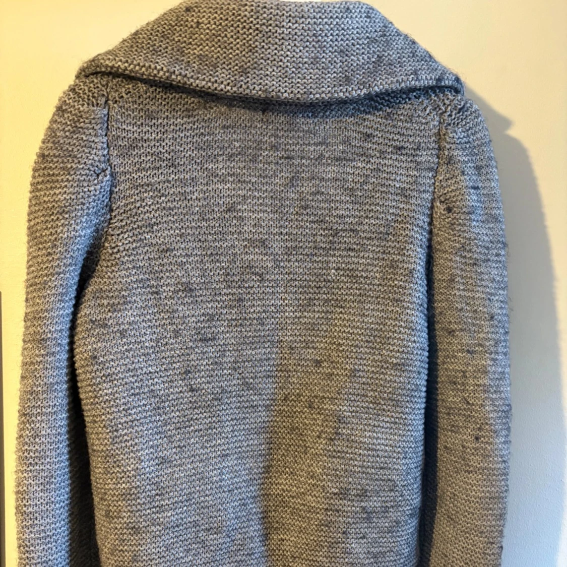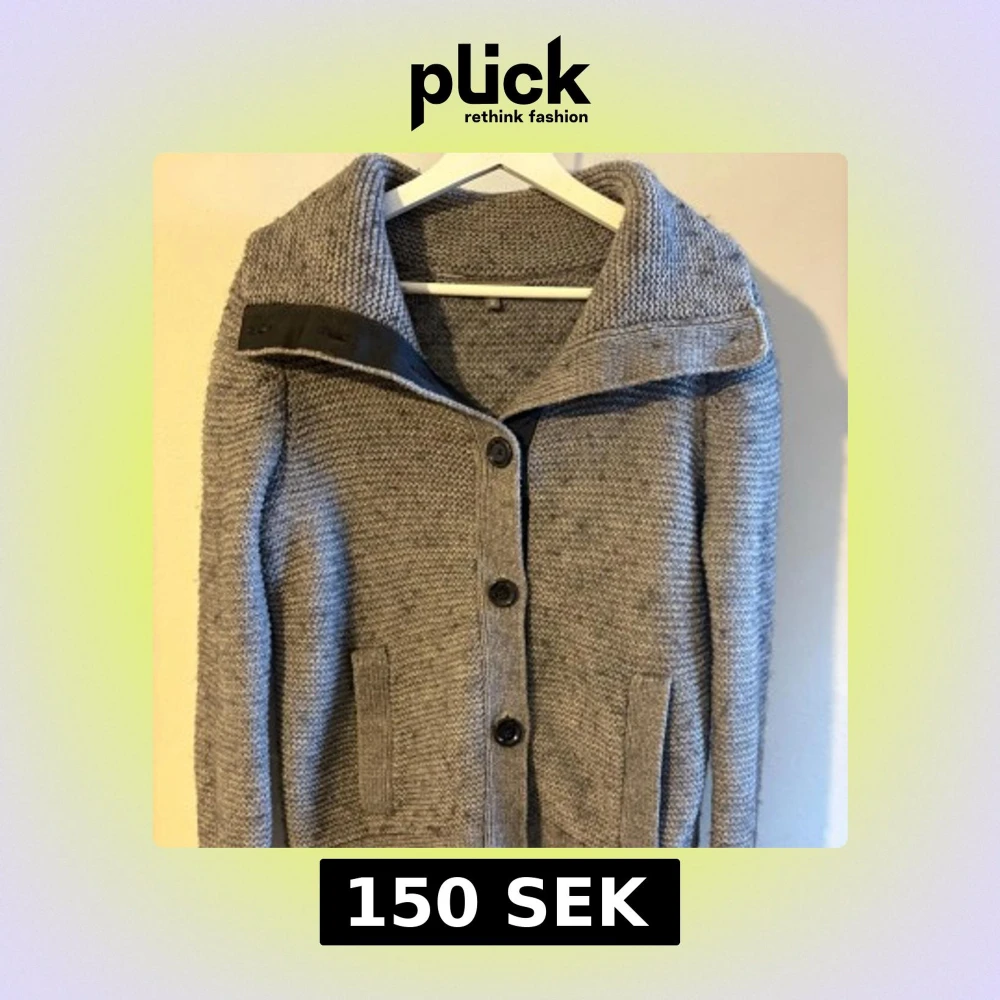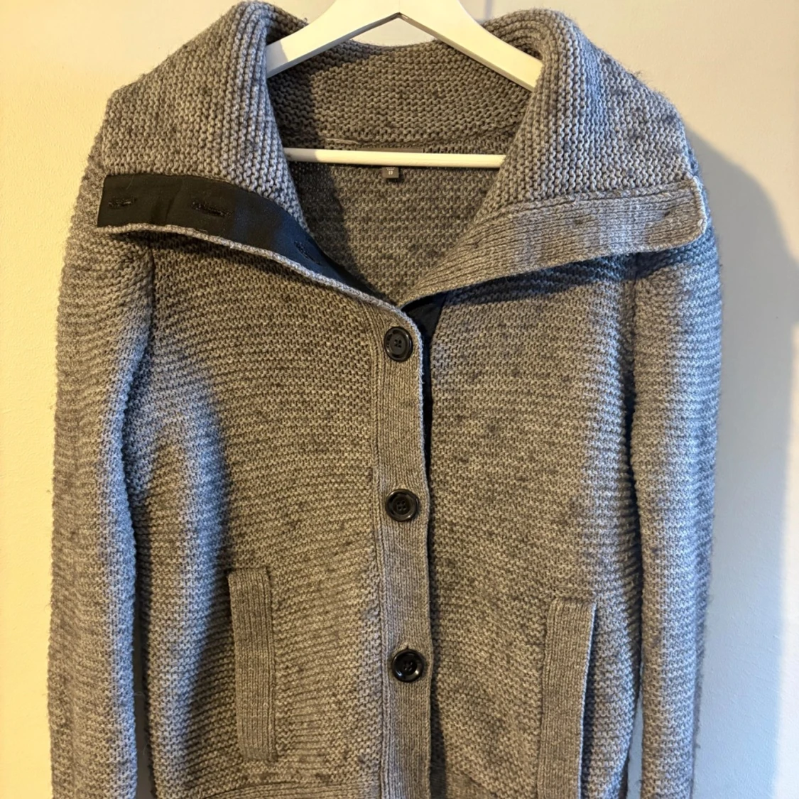 Mysig grå stickad cardigan med bred krage och stora svarta knappar framtill. Koftan har två fickor och en snygg detalj i svart vid kragen. Perfekt en stilren look!