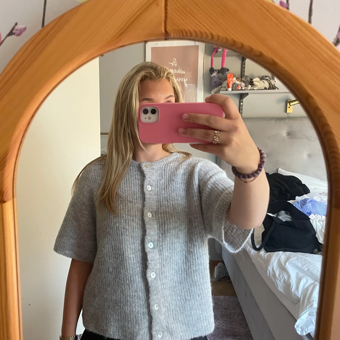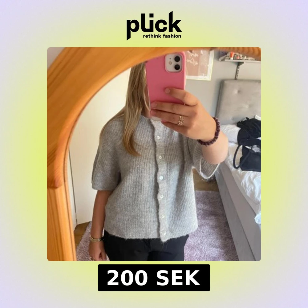 Supermysig grå stickad kofta med korta ärmar och knappar. 💓💓Perfekt att slänga över en t-shirt eller linne för en chill look. Storlek M och sitter lite stort på mig som vanligtvis har S