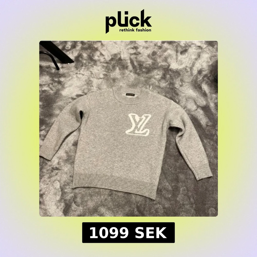 Snygg grå stickad tröja från Louis Vuitton med stort vitt LV-logo framtill. Tröjan har rund hals, ribbade muddar och långärmad passform. Perfekt för dig som gillar exklusiva märken och vill ha en stilren look.