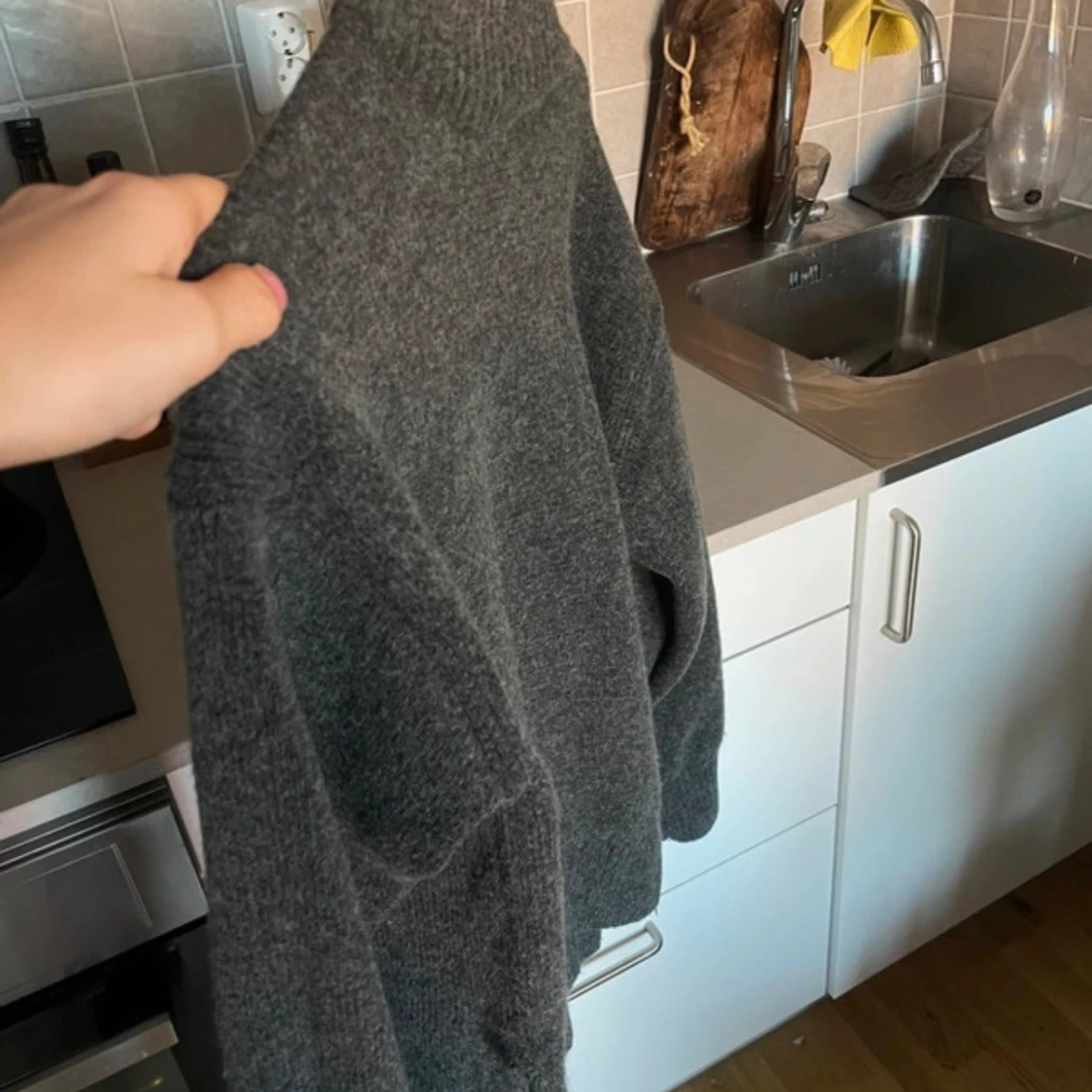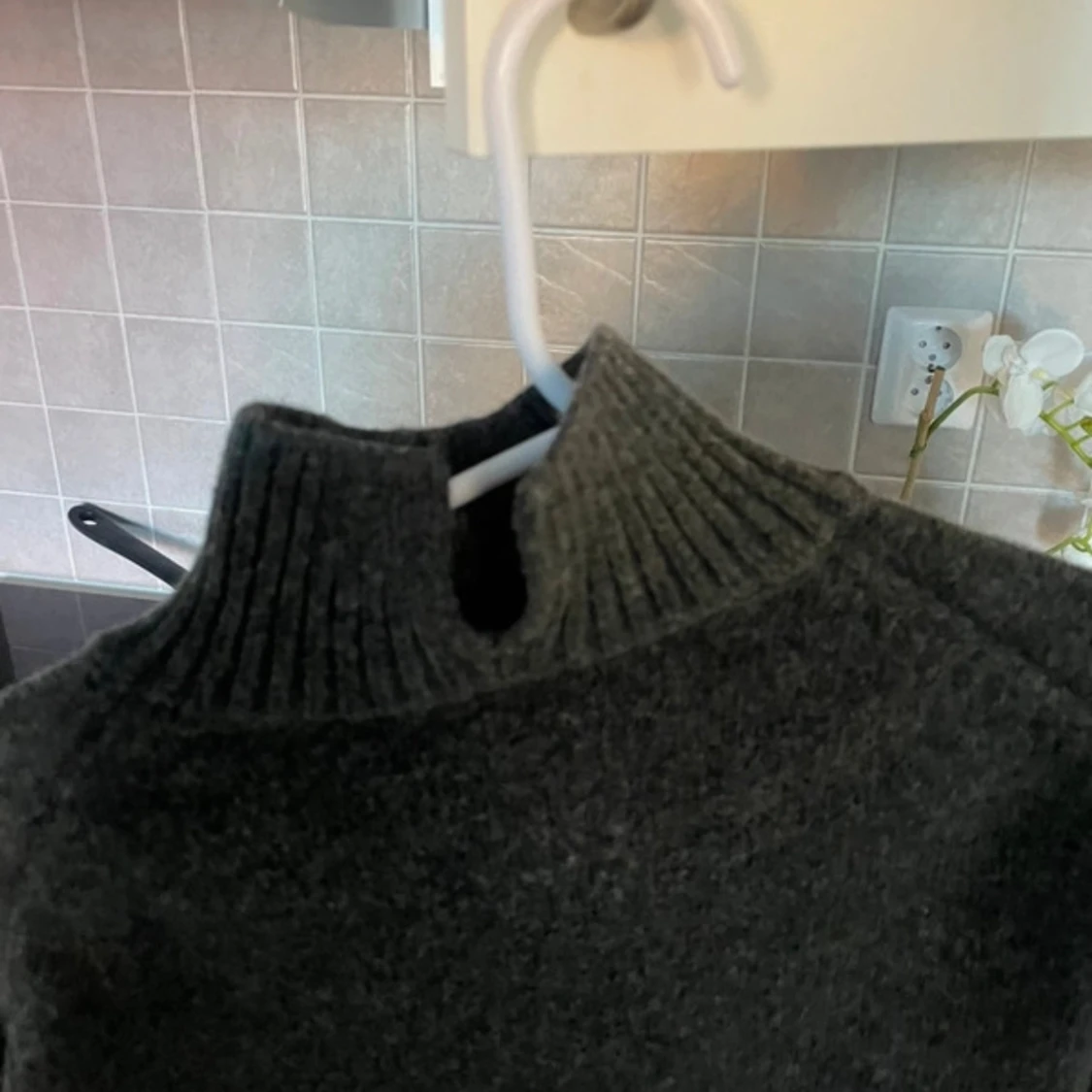 En varm och bekväm grå stickad polotröja med ribbstickad krage. Tröjan har långa ärmar och en lös passform med detaljer såsom slits vid sidorna, vid kragen och i armarna, perfekt för kyligare väder.