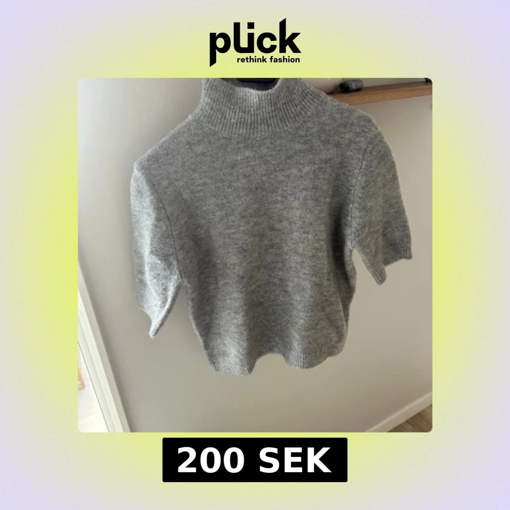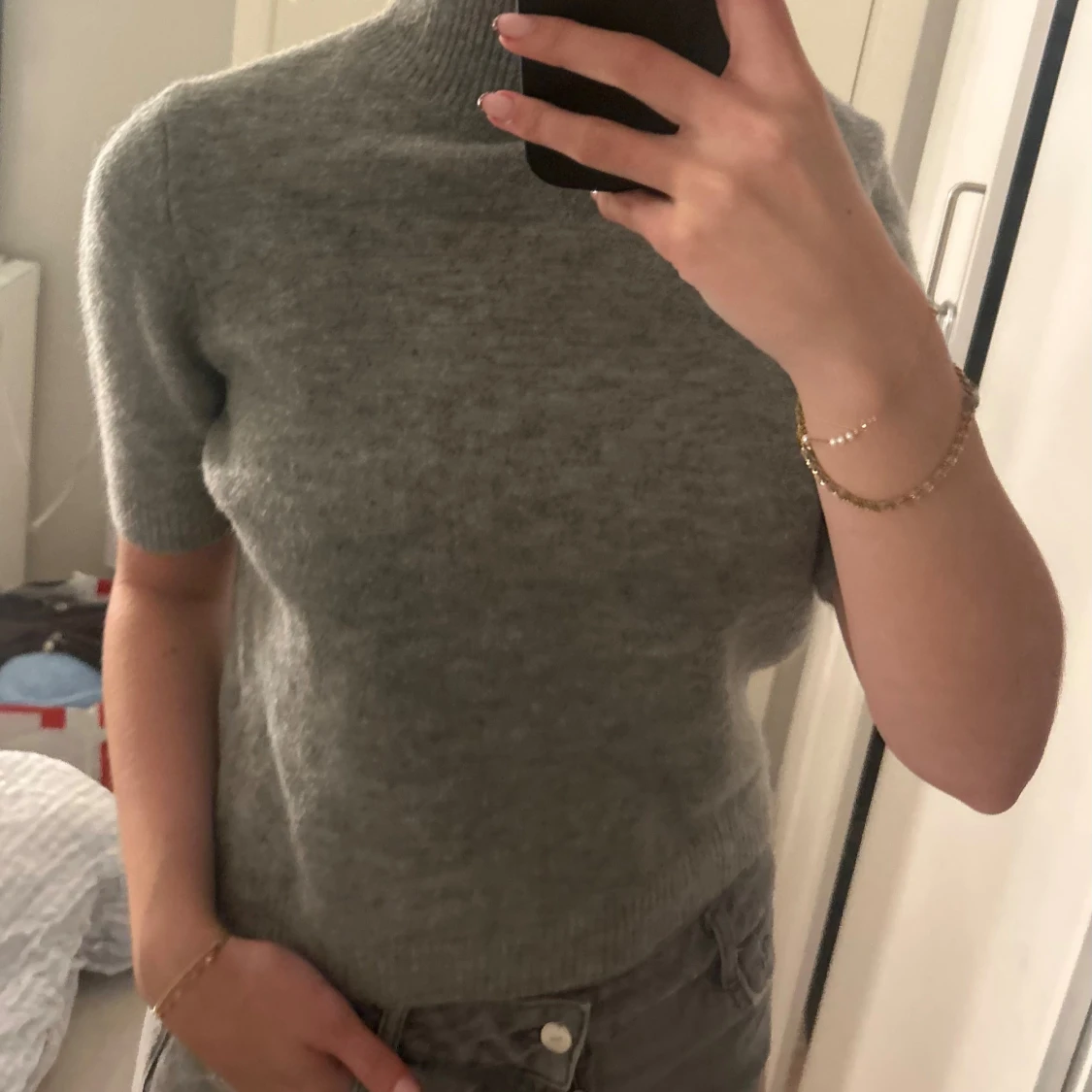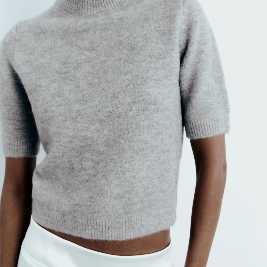 Supermjuk och stilren grå stickad polotröja med korta ärmar och ribbad hög krage. Perfekt till jeans eller kjol för en clean look. Tröjan har en något croppad passform och är gjord i ett mysigt material som känns lyxigt mot huden.