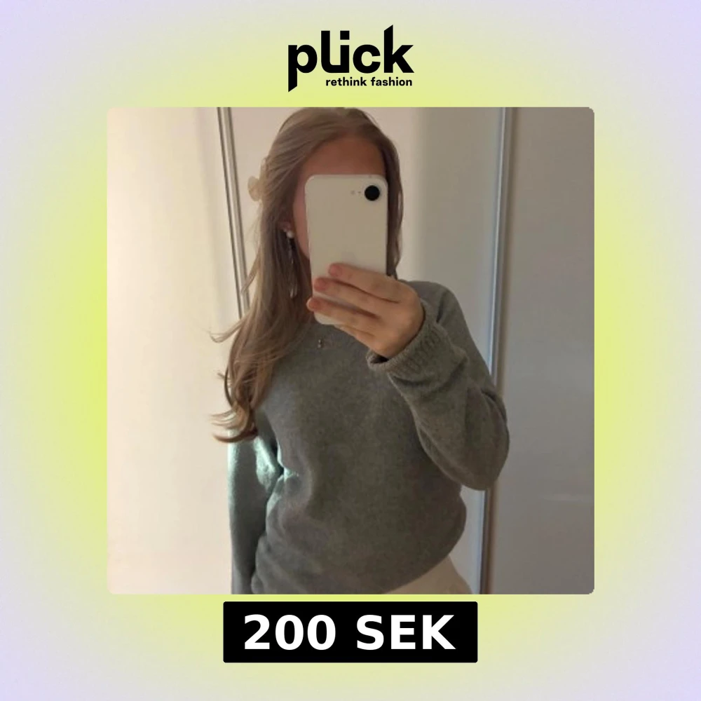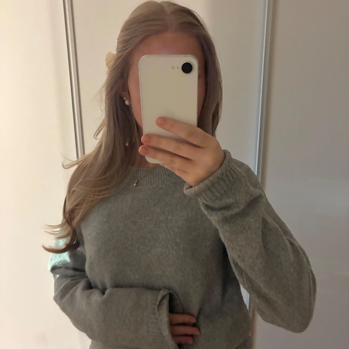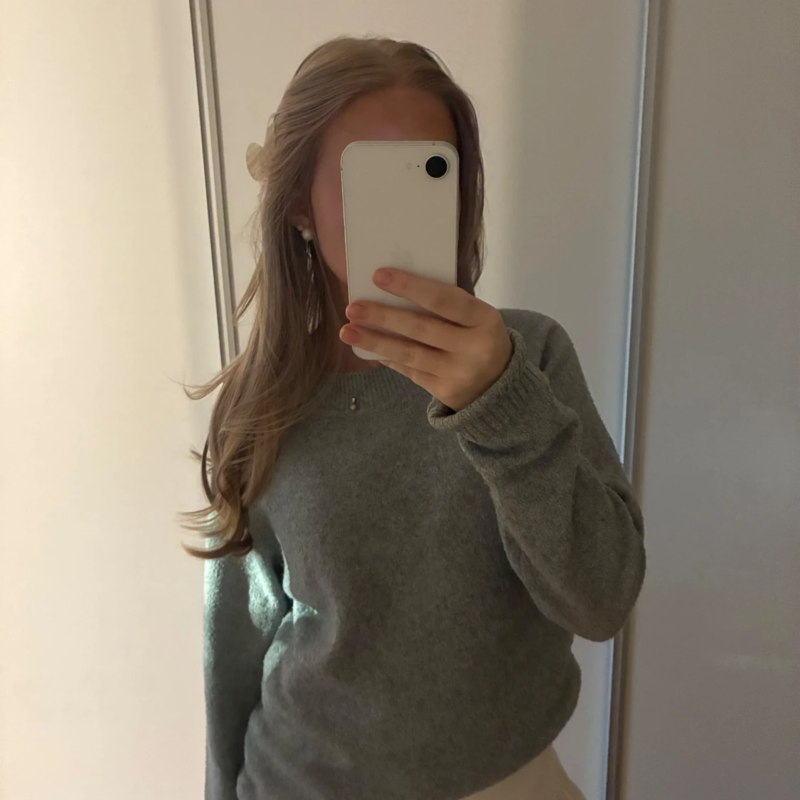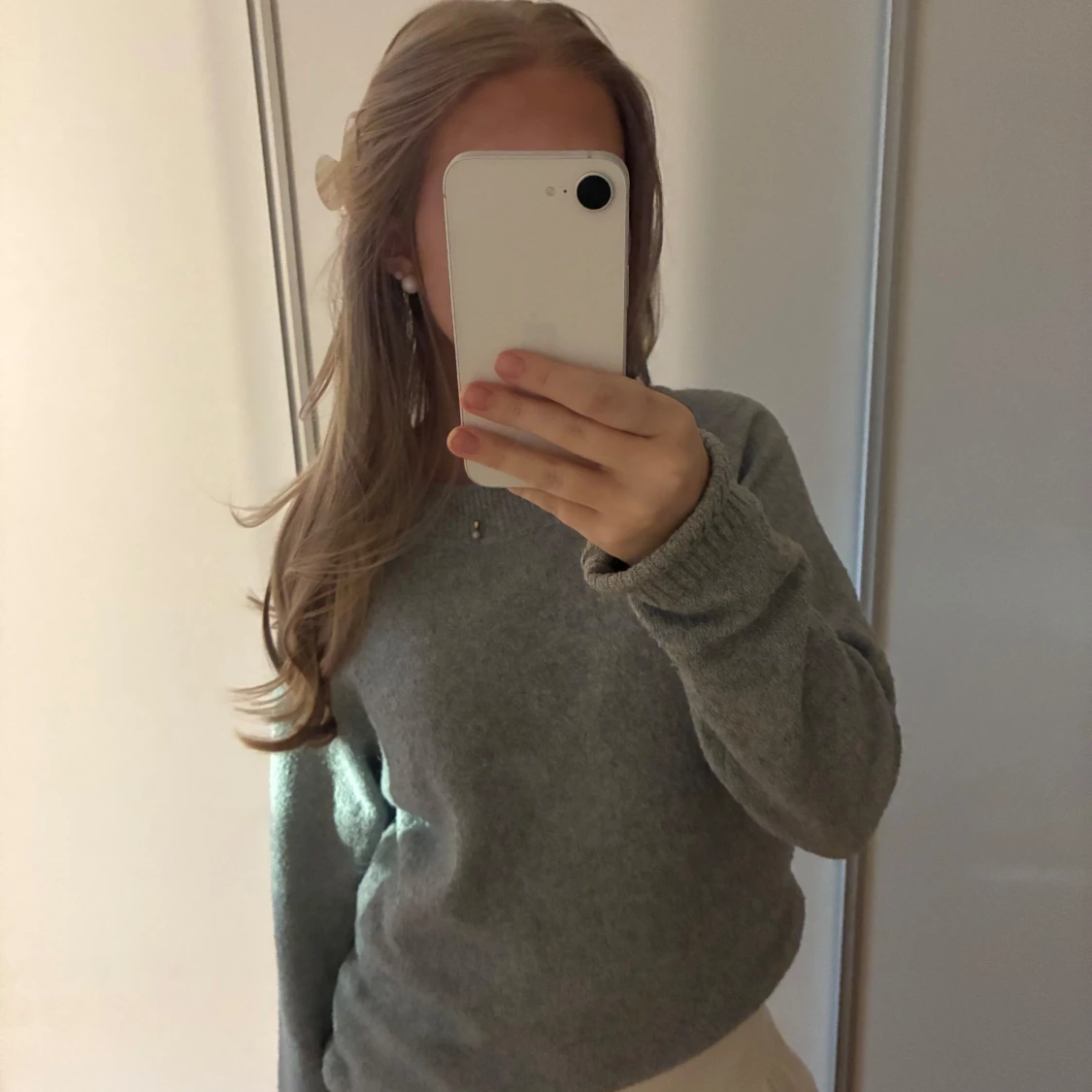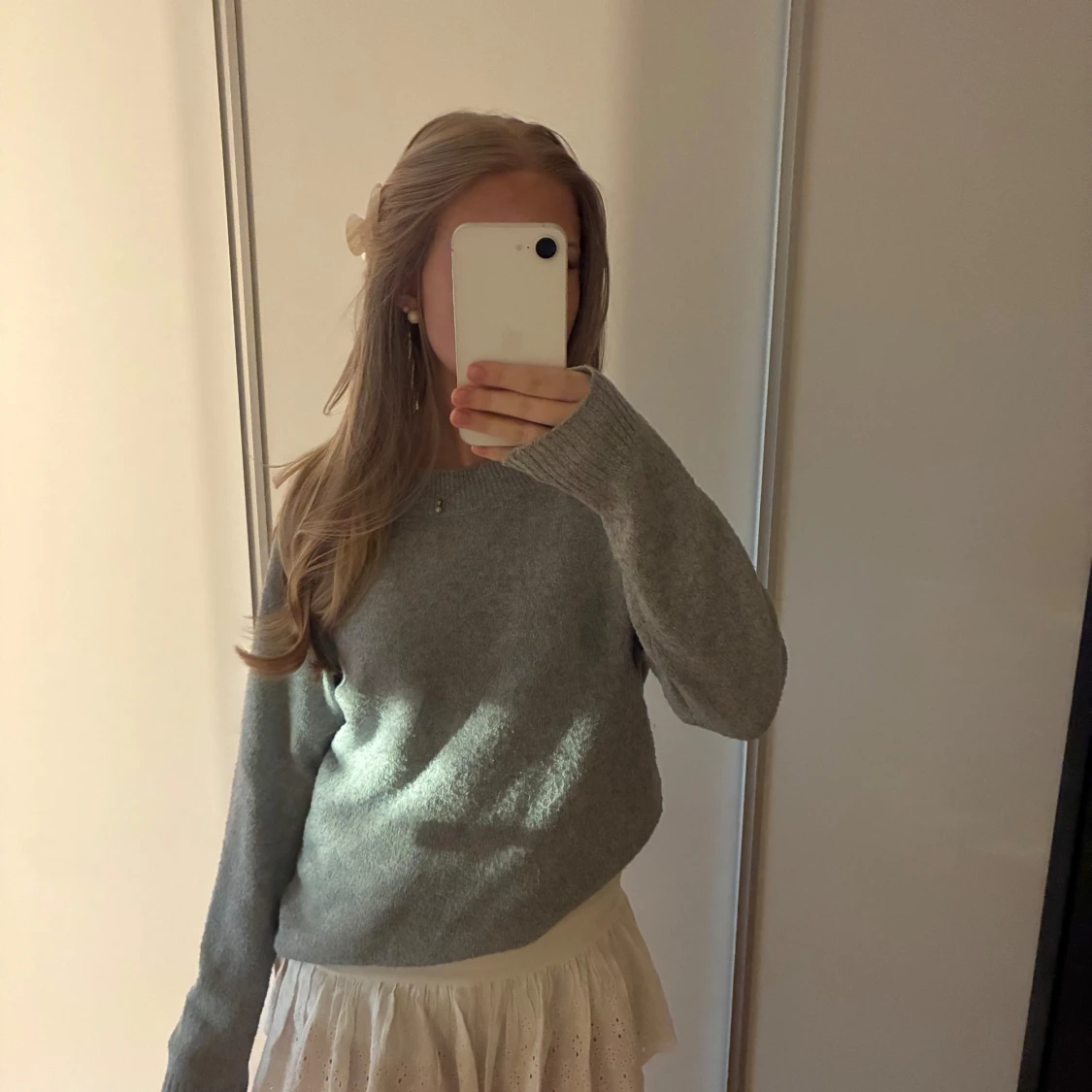 Mysig grå stickad tröja med rund hals och långa ärmar. Tröjan är knappt använd. Perfekt att matcha med kjol eller jeans.