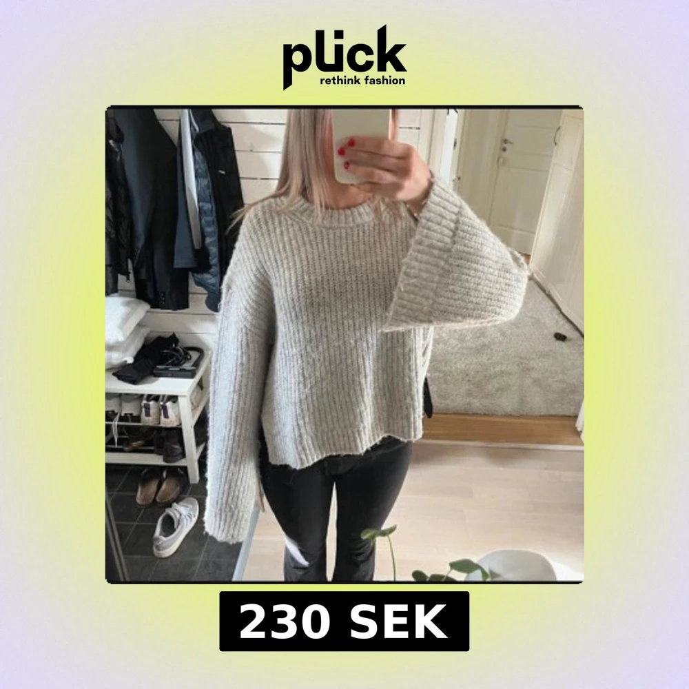 Ljusgrå stickad tröja med slits vid båda sidor av tröjan och längst ner vid båda ärmarna. Använd fåtal gånger så tröjan är bra kvalitet. Tröjan är ganska kort och boxig.