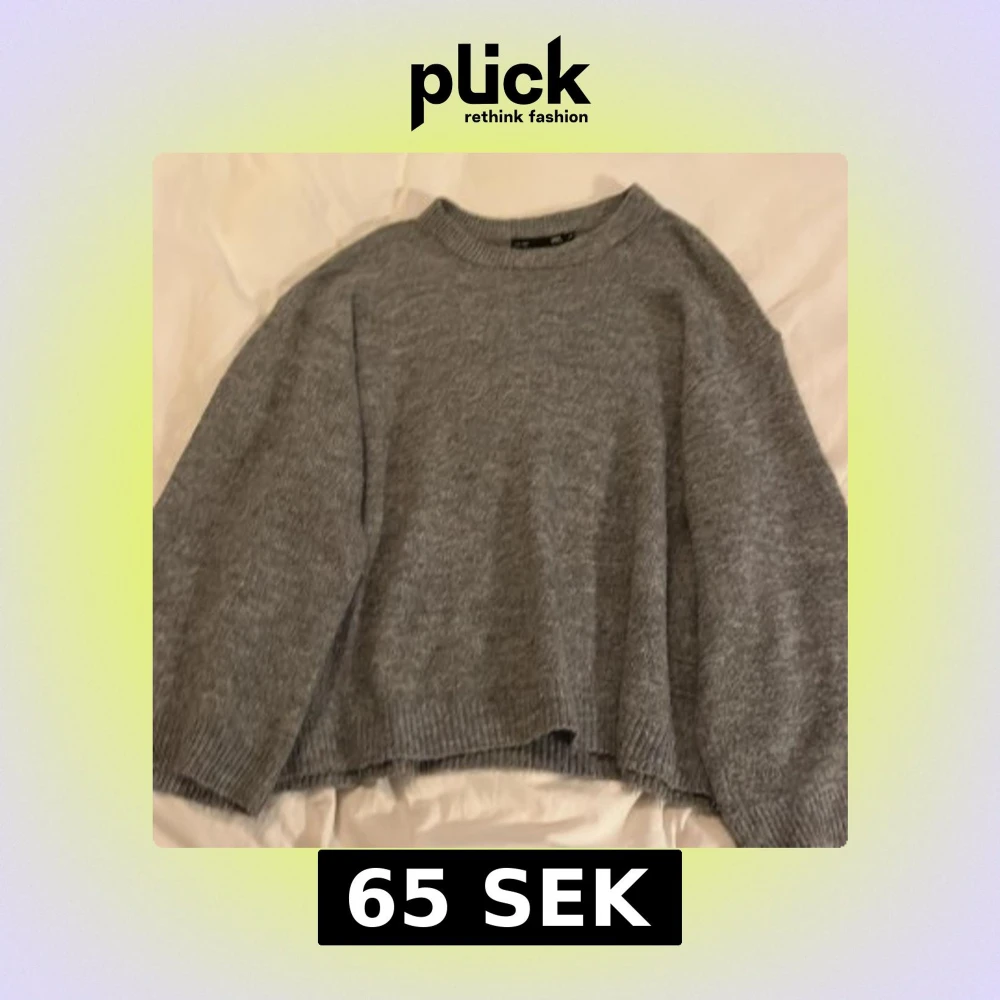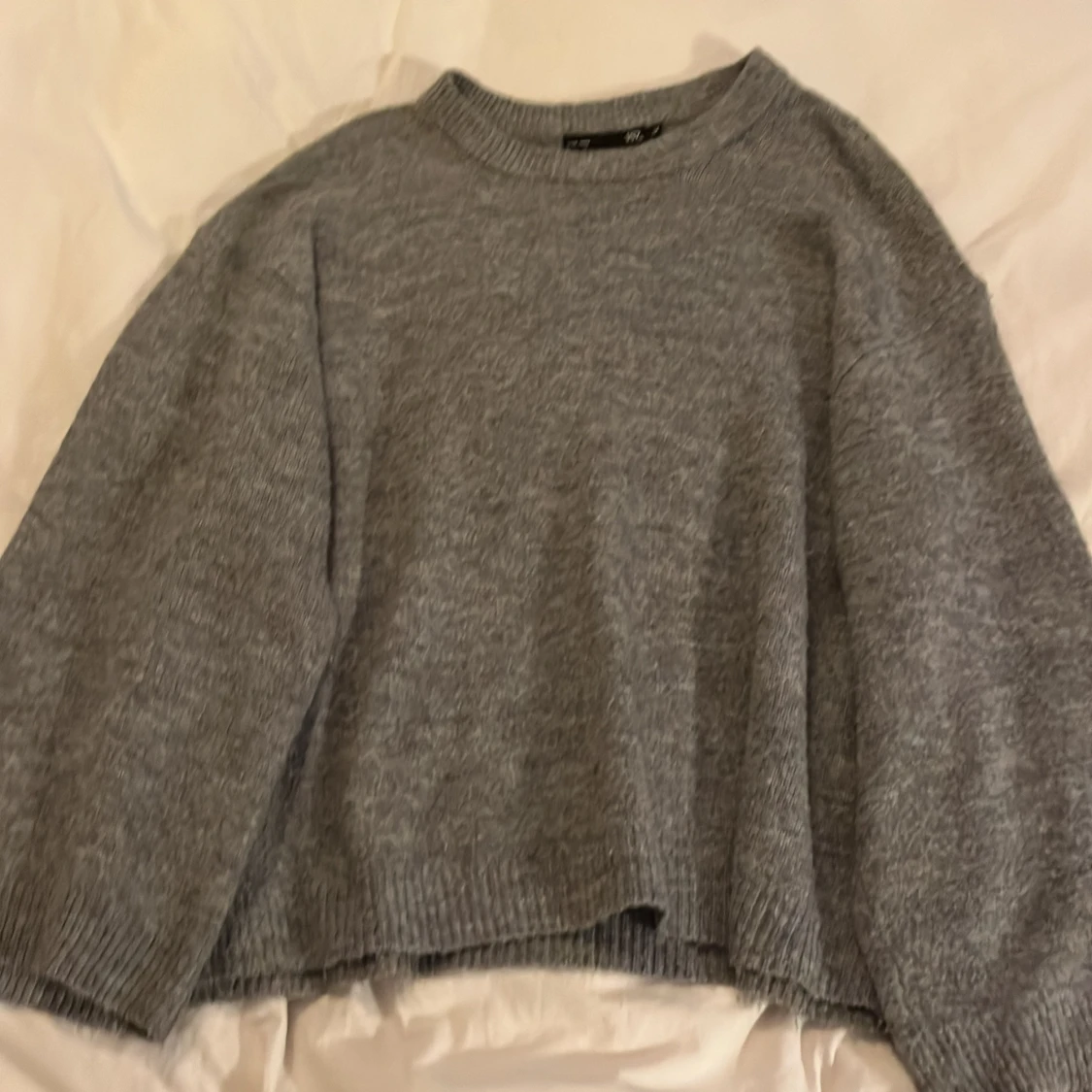 Mysig grå stickad tröja med rund hals och långa ärmar. Perfekt för kyliga dagar.