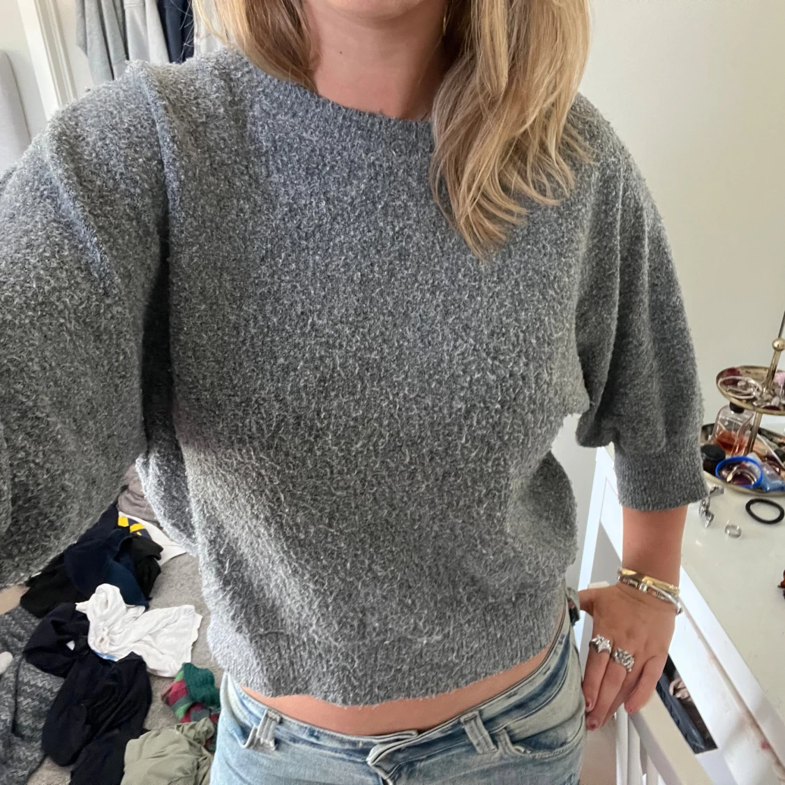 Säljer en grå stickad tröja från Lindex. Tröjan har trekvartsärmar och är mjuk och skön, perfekt för att slänga på sig när det är lite kyligt. Enkel och stilren design som funkar till jeans eller kjol.