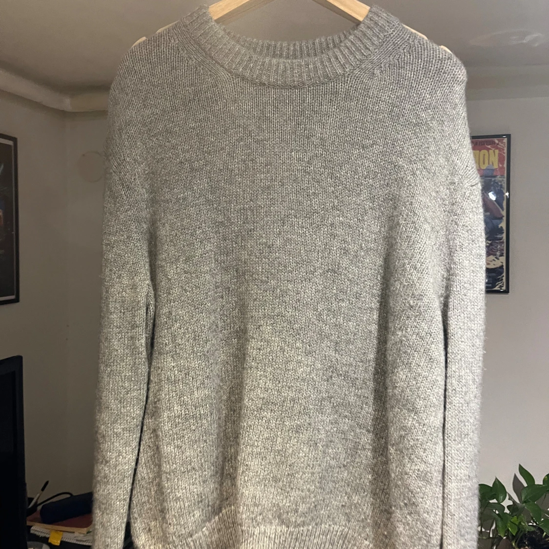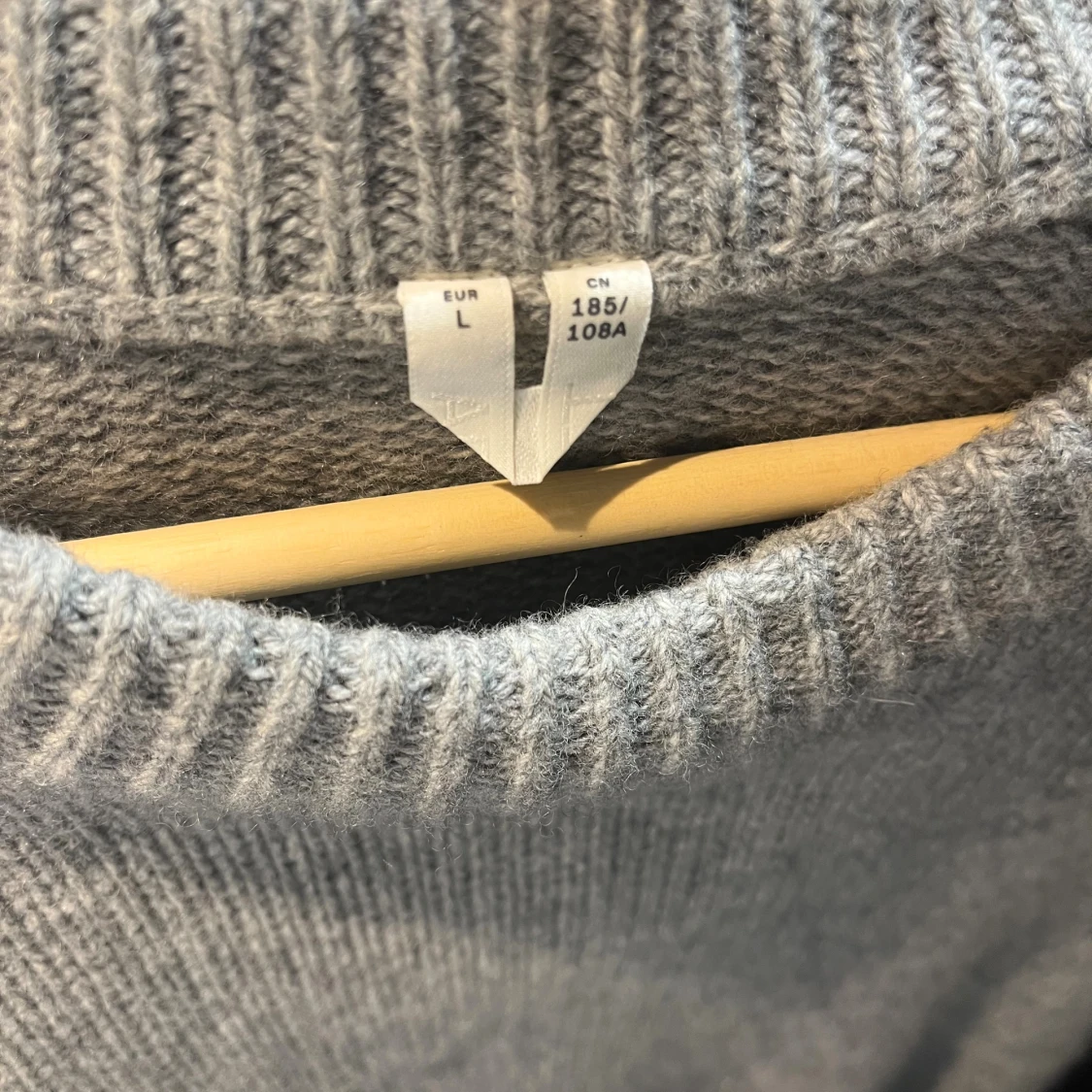 En klassisk grå stickad tröja från arket i storlek L. Tröjan har rund halsringning, ribbade muddar och är långärmad. Perfekt för lager-på-lager och chill höst- och vinterstil.
