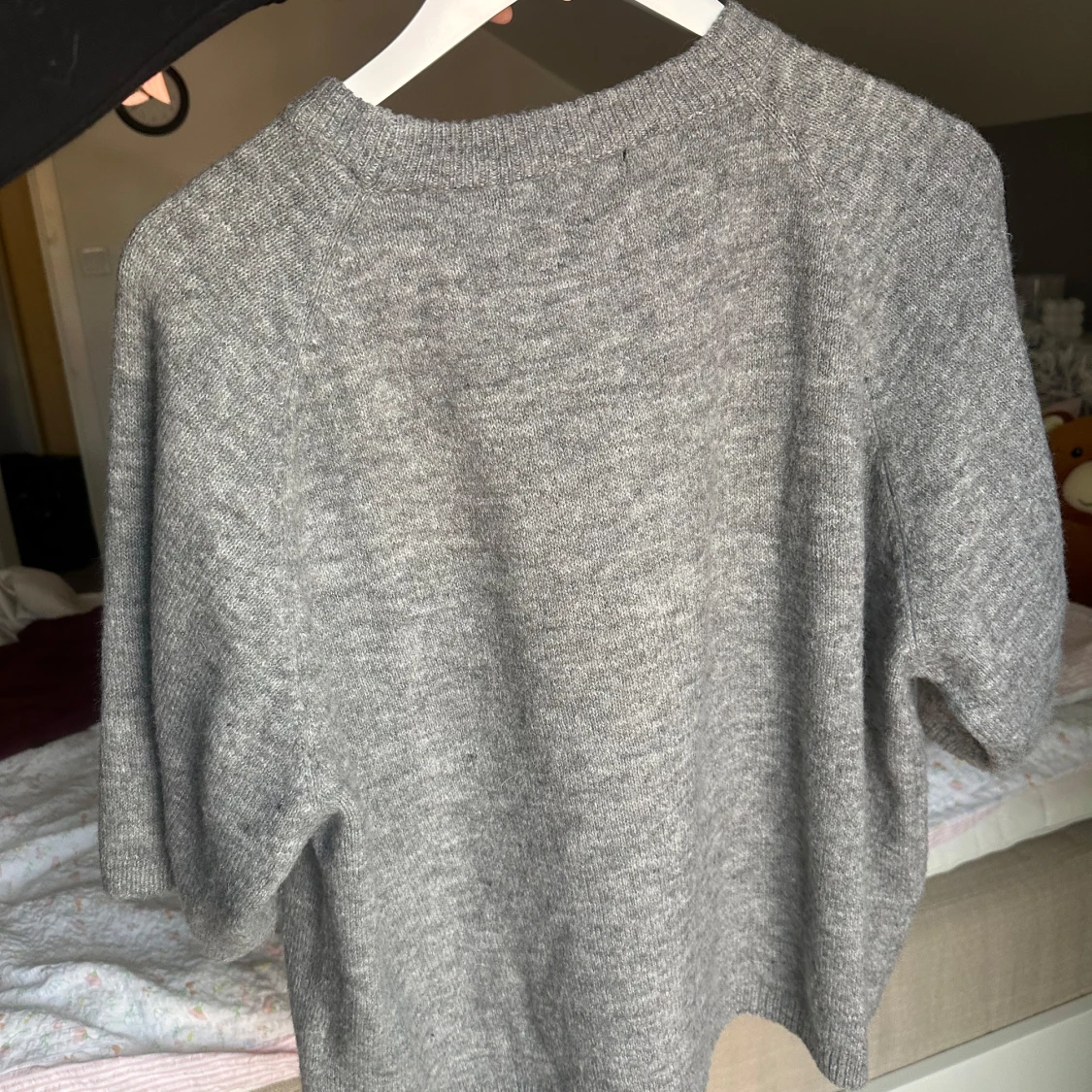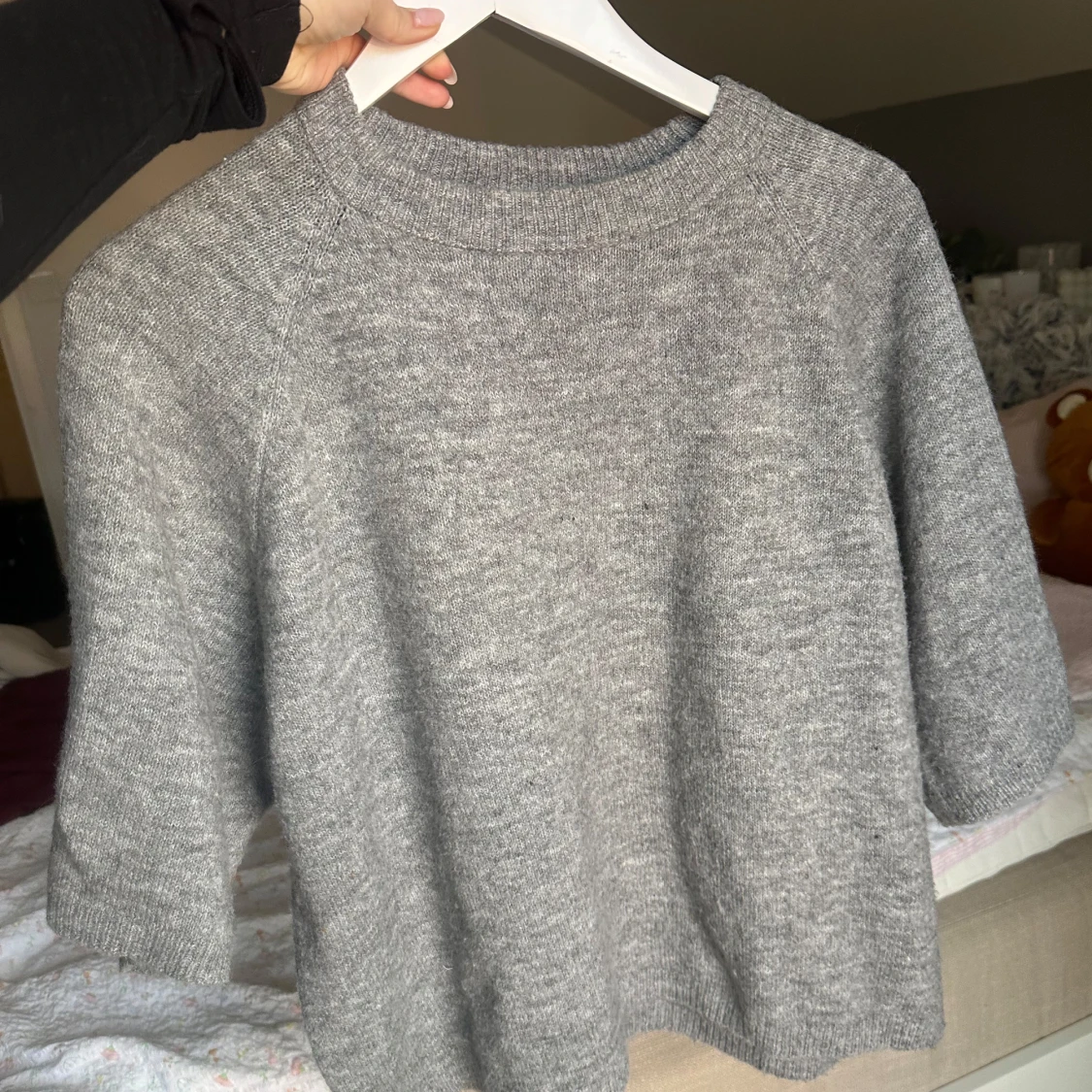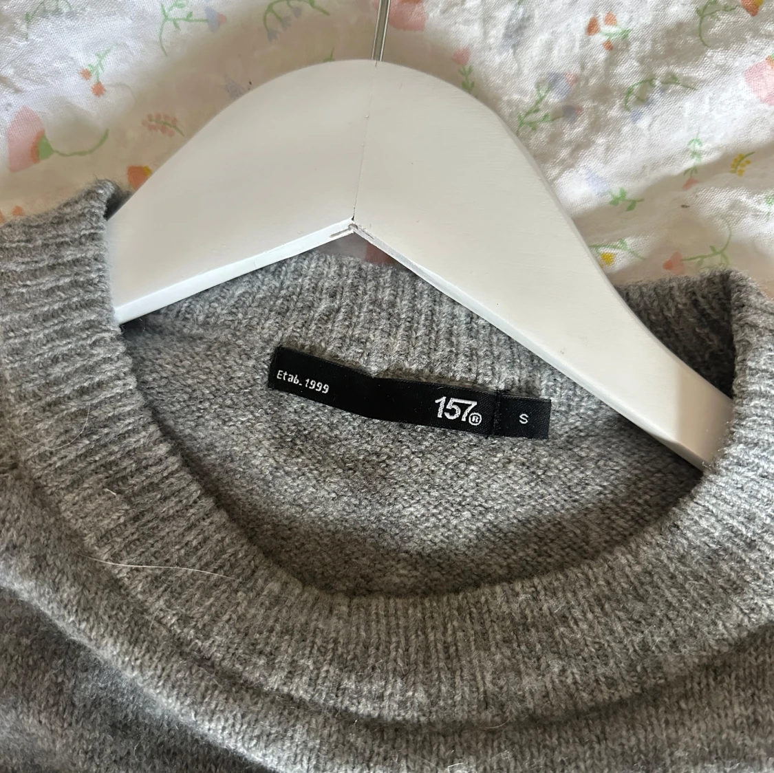 Säljer en stilren grå stickad tröja från 157. Tröjan har en klassisk rund hals och trekvartsärmar, perfekt för lager på lager under kyligare dagar. Den är mjuk och bekväm, idealisk för både vardag och avslappnade tillfällen. Passar perfekt till jeans eller kjol!