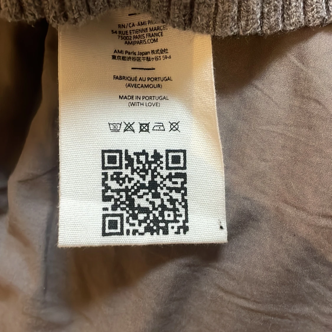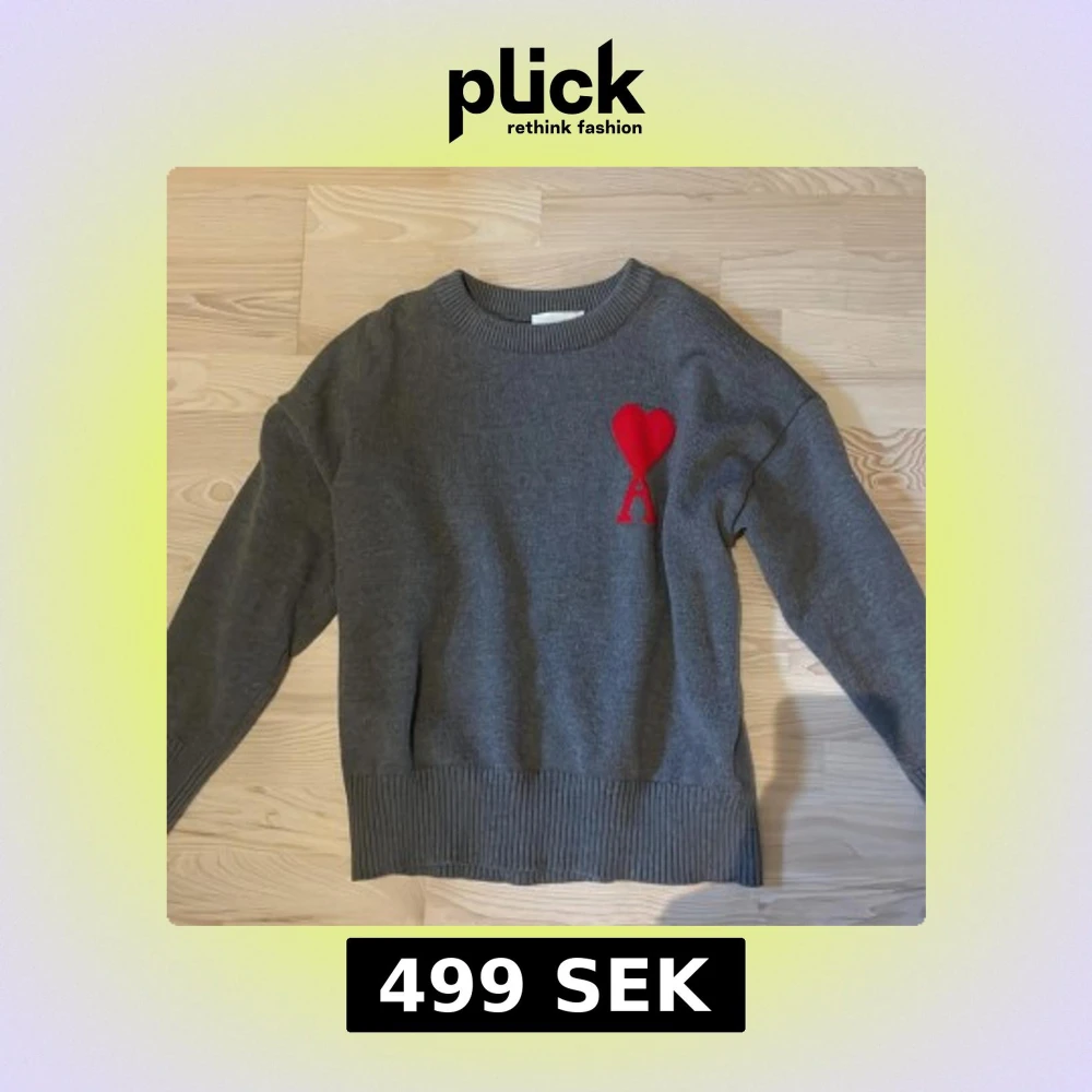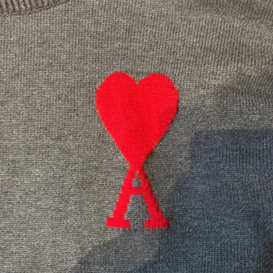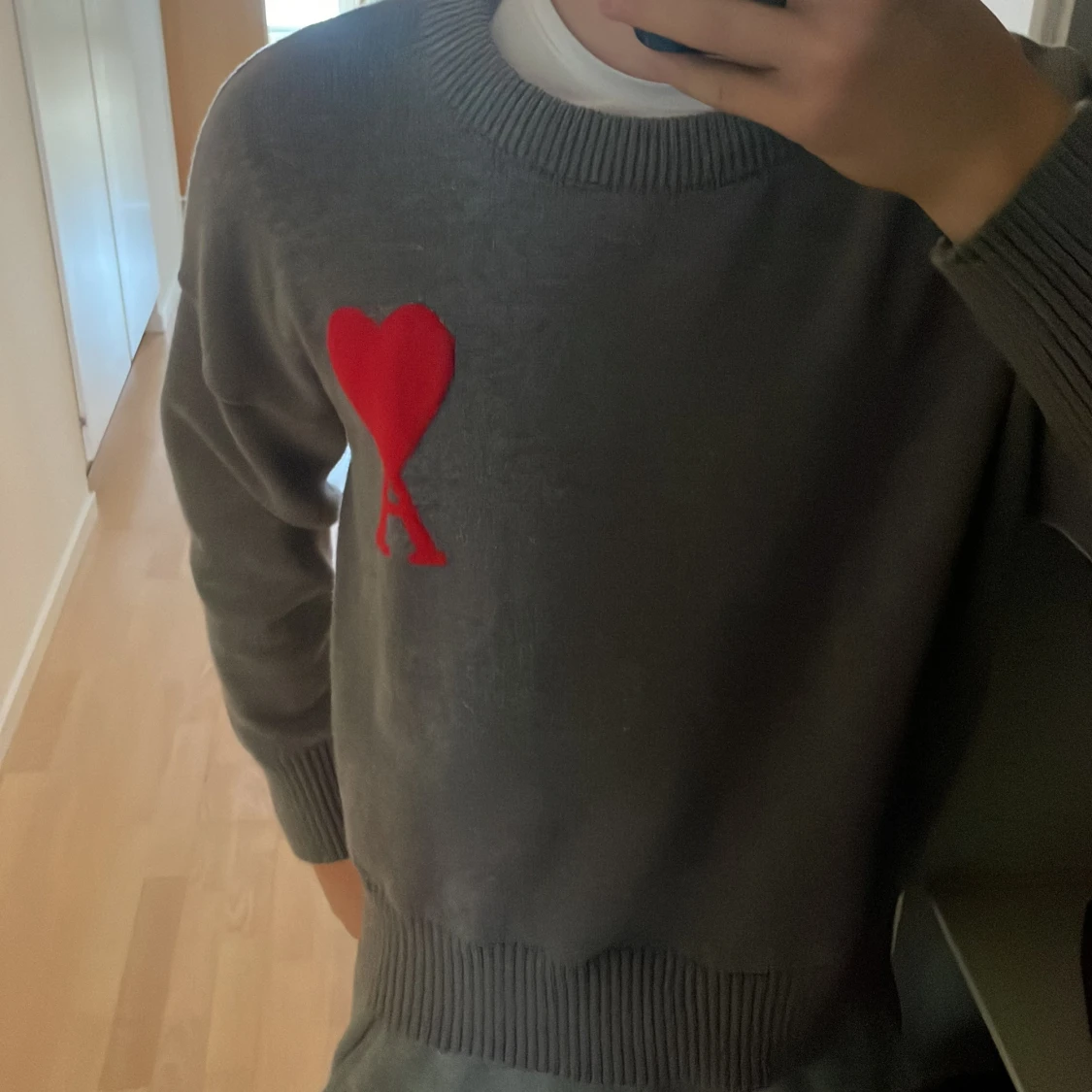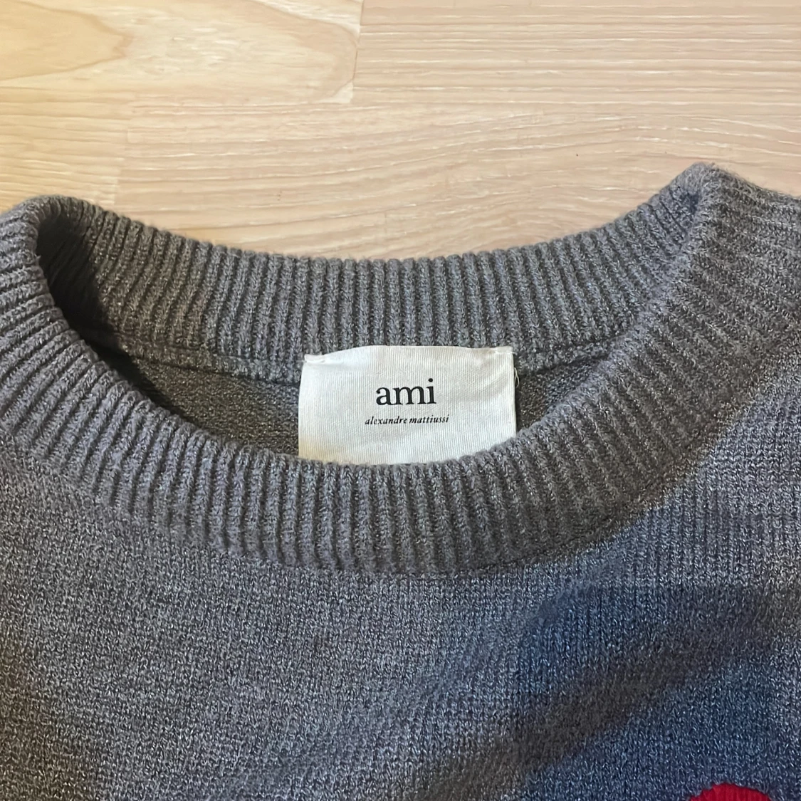 Snygg grå stickad tröja från Ami Paris med rund hals och ribbade muddar. På bröstet finns Ami:s ikoniska röda hjärta med bokstaven A. Perfekt för dig som vill ha en stilren men ändå unik look.