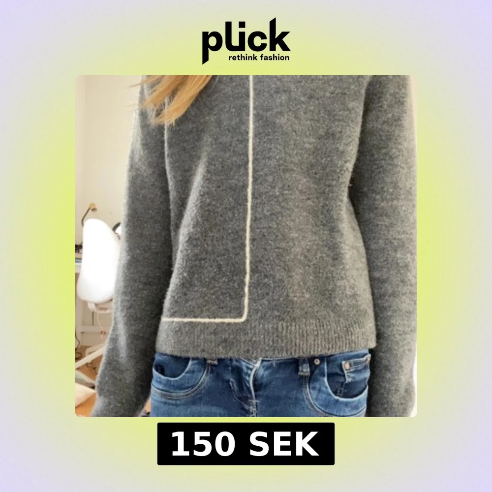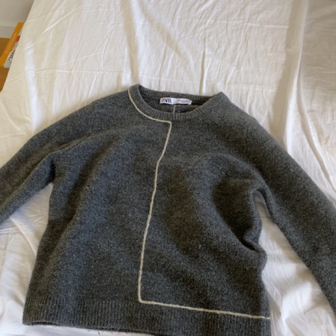 Mysig grå stickad tröja från zara med en vit dekorativ linje som går från halsen och ner längs framsidan. Tröjan har rund halsringning och långa ärmar. Perfekt för kyliga dagar!