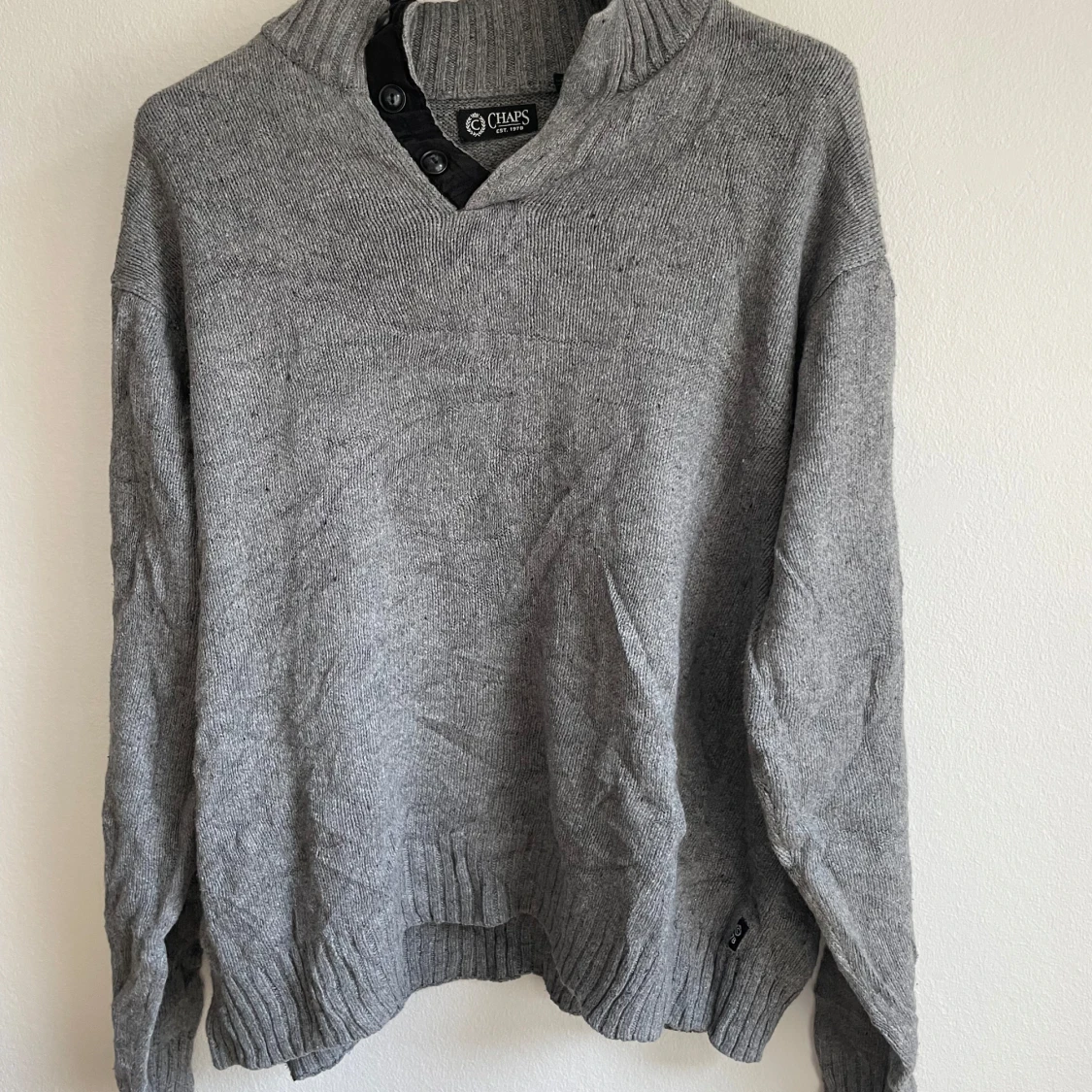 Säljer en stilren grå stickad tröja från Chaps med ribbad krage och knappar vid halsen. Tröjan har långa ärmar och ribbade muddar vid ärmslut och nederkant. Perfekt för kyliga dagar!