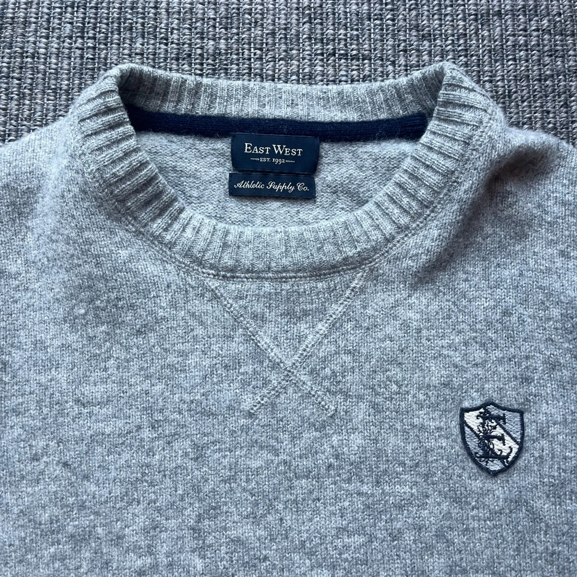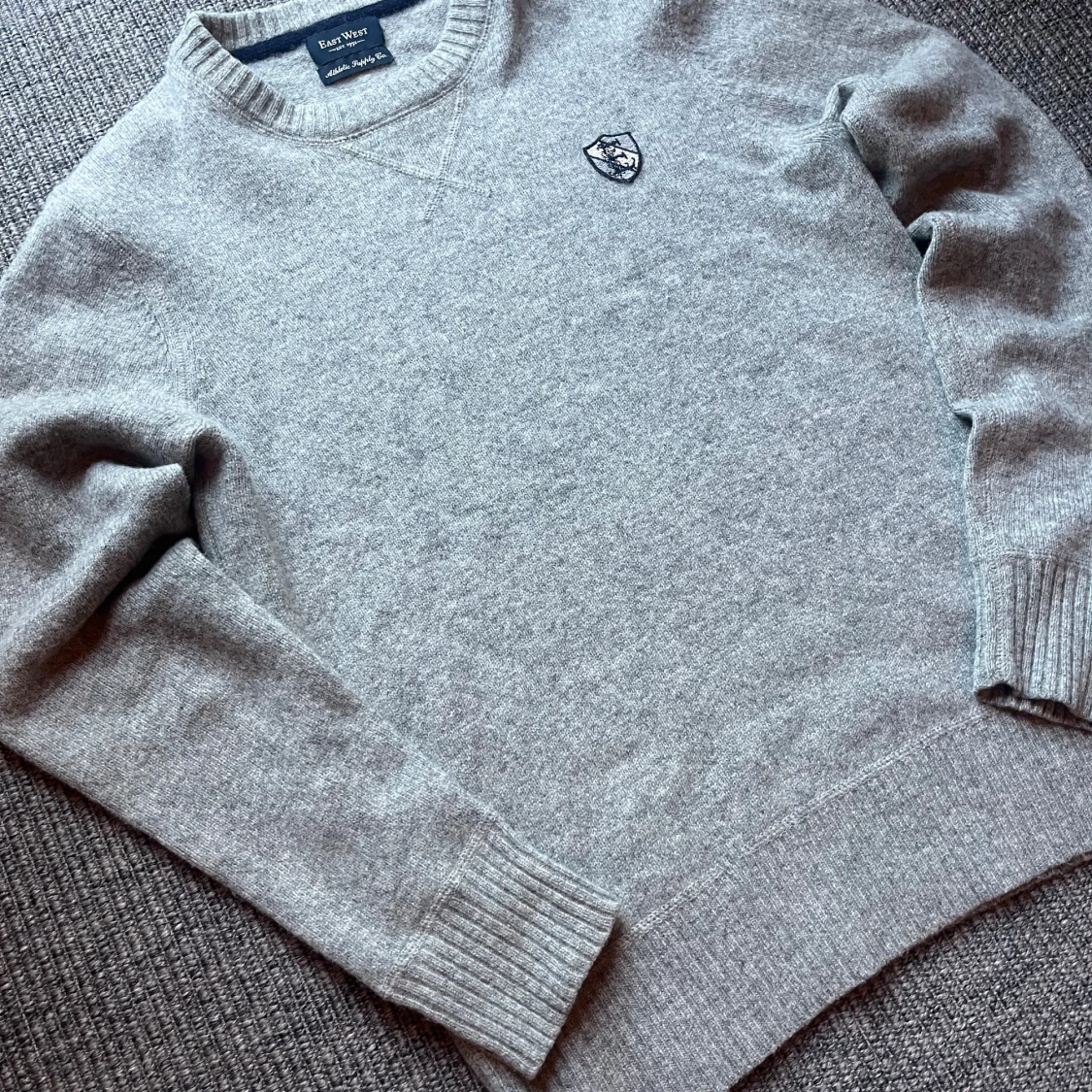 Snygg grå stickad tröja från East West med rund halsringning och broderad patch på bröstet. Tröjan har ribbade muddar vid ärmslut och nederkant, vilket ger en clean och klassisk look. Perfekt för lager-på-lager under kyliga dagar. Skickar imon 1-2 dagar och svarar snabbt vid frågor och funderingar😄kom med prisförslag🙌