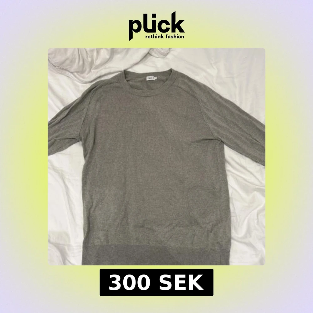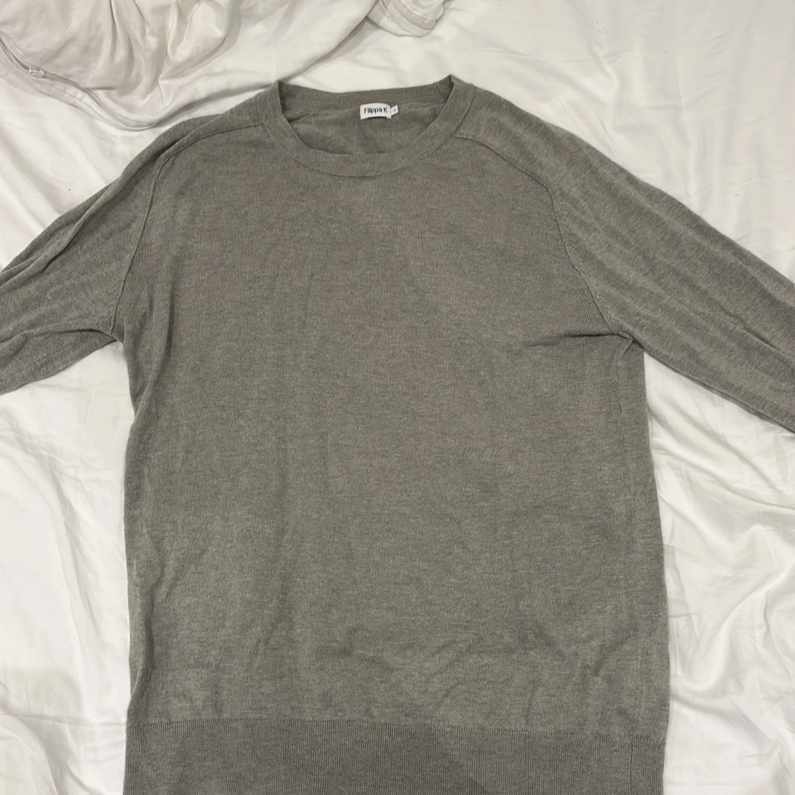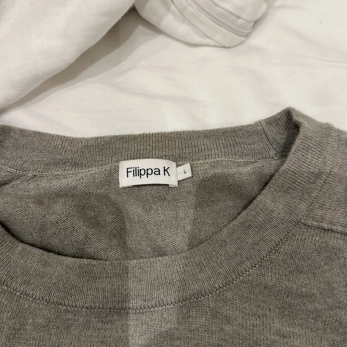 Säljer en stilren grå stickad tröja från Filippa K. Tröjan har rund halsringning och långa ärmar