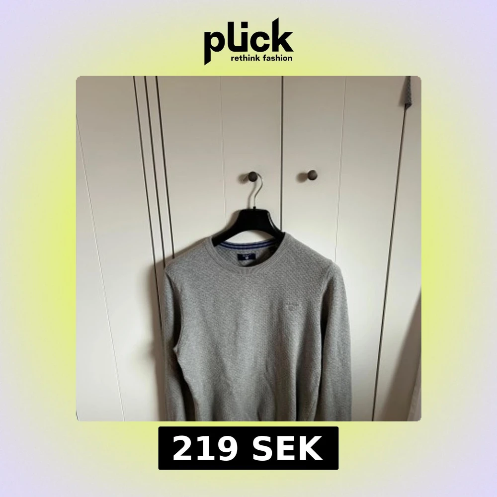 Säljer en klassisk grå stickad tröja från GANT i storlek S. Tröjan har rund halsringning med blå och vit randig detalj på insidan av kragen. Perfekt för lager-på-lager och enkel att matcha.