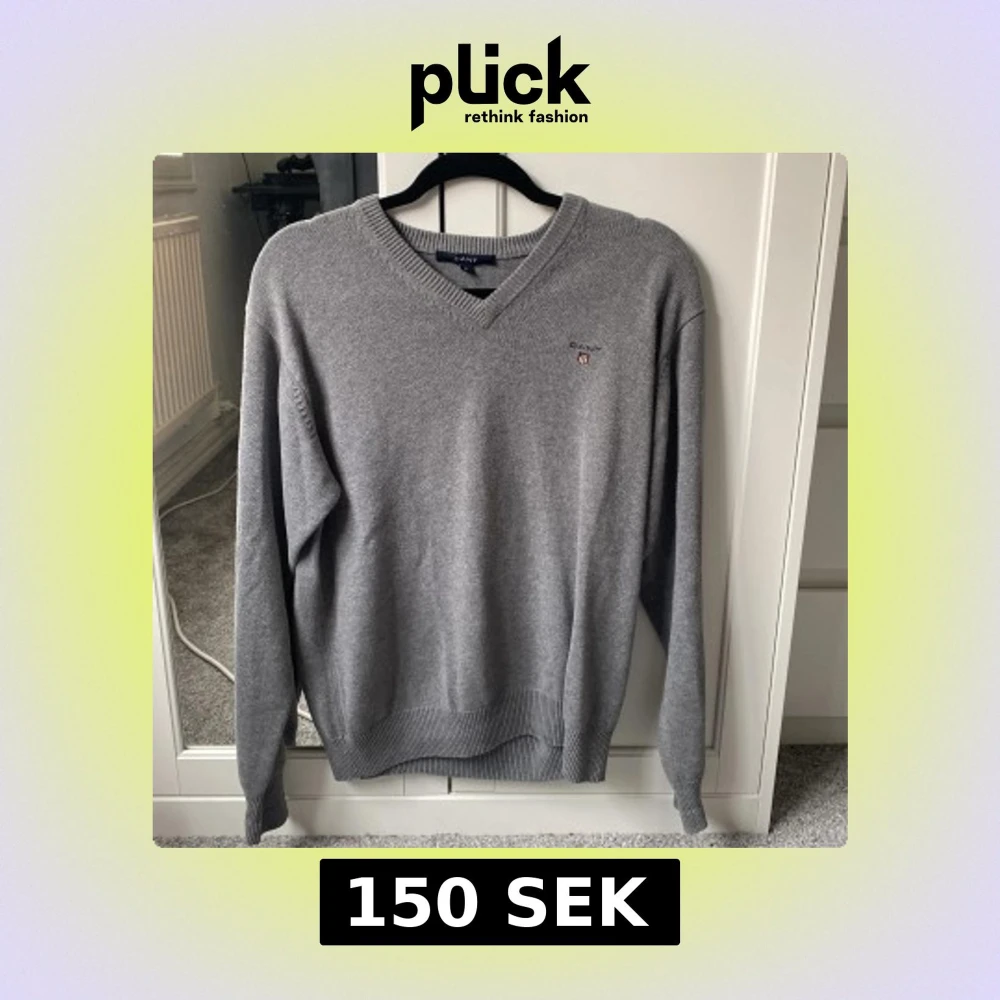Grå stickad tröja från GANT i storlek S med v-ringad hals har hål i underarmarna men är väldigt enkelt att fixa annars väldigt fint skick