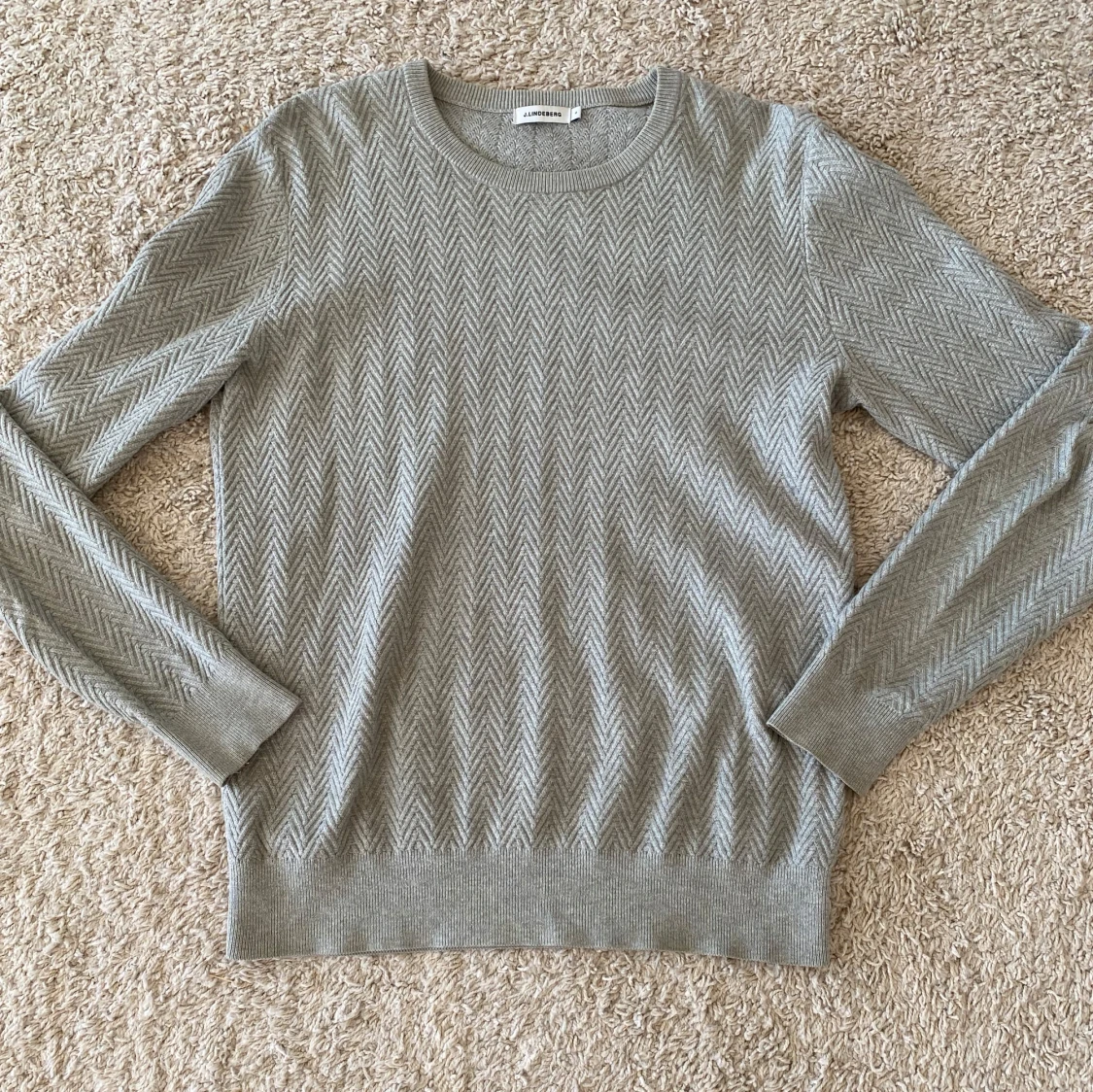 Snygg grå stickad tröja från J.Lindeberg med ett stilrent fiskbensmönster över hela plagget. Rund halsringning och långa ärmar. Perfekt för dig som gillar klassisk men modern stil. Materialet är mjukt och skönt mot huden.