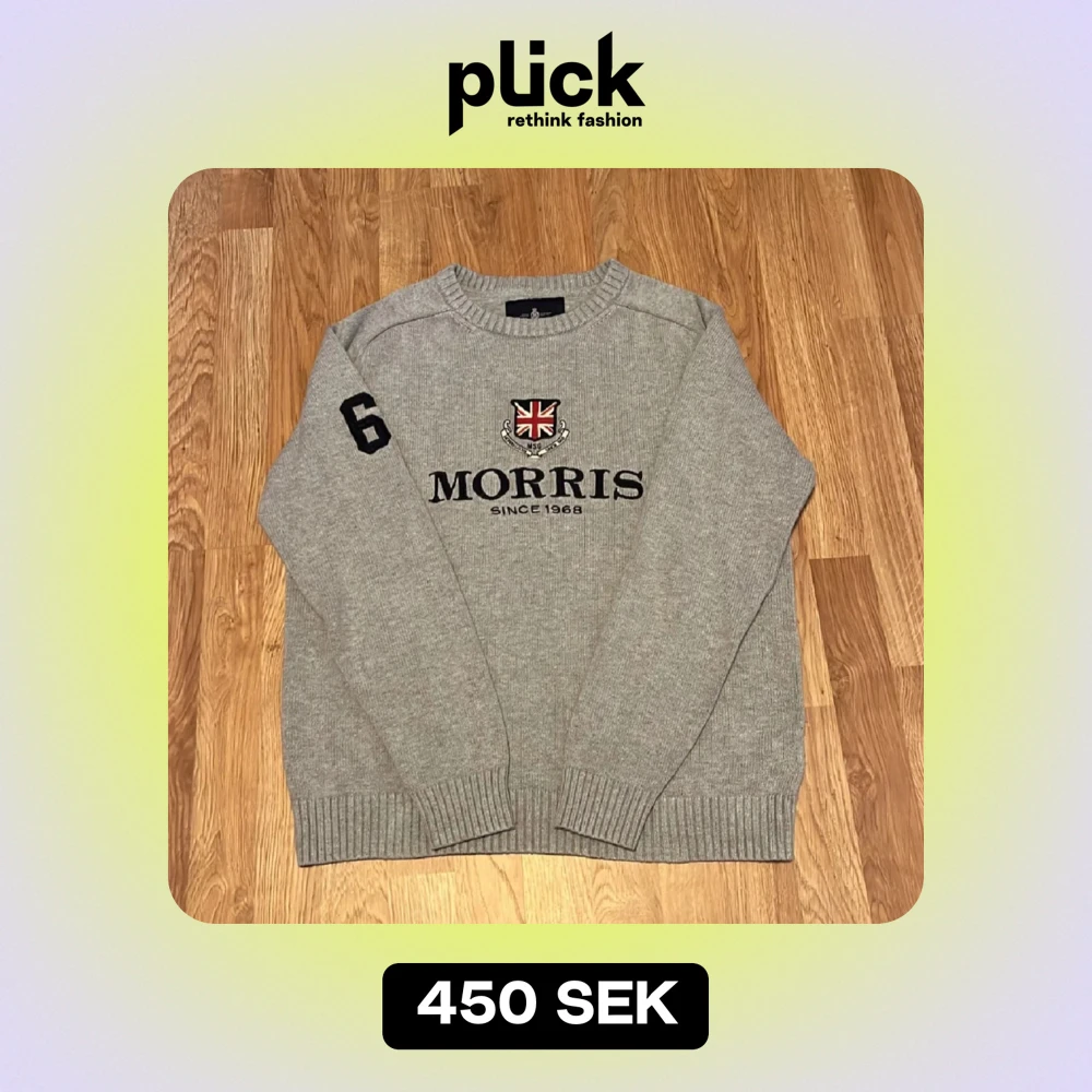 Säljer en snygg grå stickad tröja från Morris large men passar även Medium. med ett broderat emblem och text på framsidan. Tröjan har långa ärmar och ribbade muddar vid ärmslut och nederkant. Perfekt för höst och vinter!