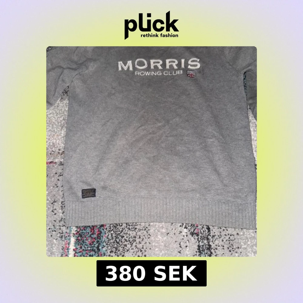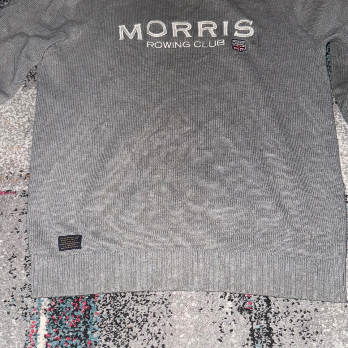 Snygg grå stickad tröja från Morris med broderad text 'Morris Rowing Club' och liten sköld på bröstet. Tröjan har rund hals, långa ärmar och ribbade muddar. Perfekt för dig som gillar klassisk och stilren look.