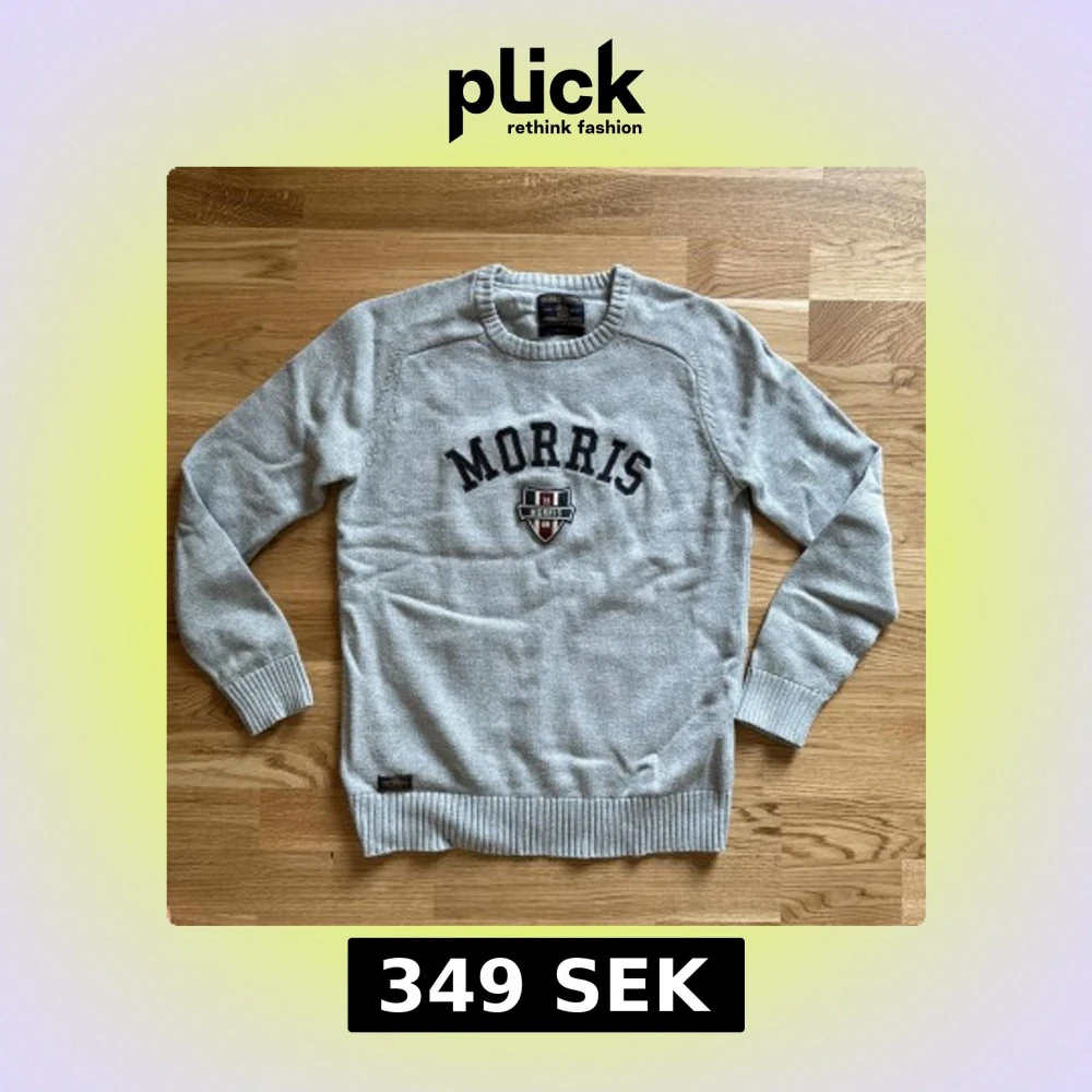 Säljer en ljusgrå stickad tröja från Morris Gents med broderad logotyp och text på bröstet. Tröjan har rund halsringning, långa ärmar och ribbade muddar vid ärmslut och nederkant. Perfekt för en stilren och avslappnad look.