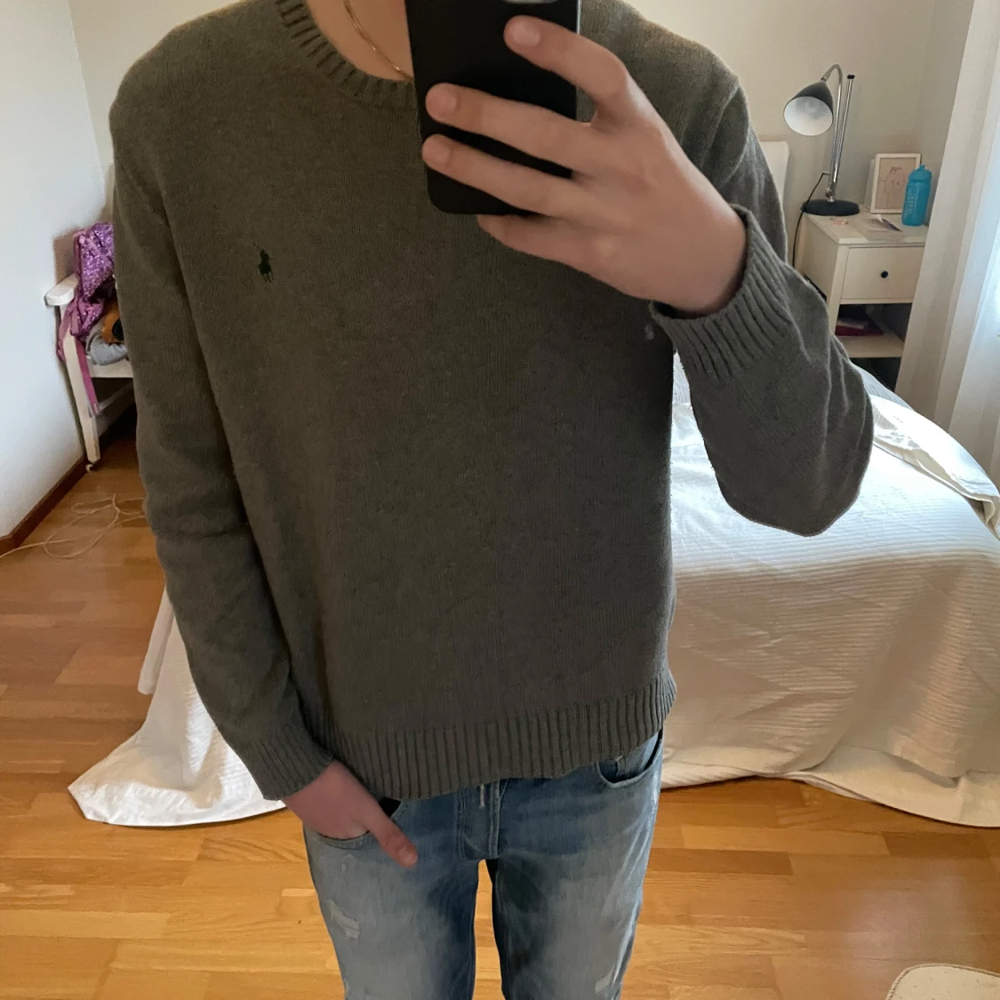 Hej! Säljer en snygg klassisk grå stickad tröja från Ralph Lauren. Tröjan har en grön häst och är i färgen grå. Skicket på tröjan är enligt mig rätt bra. Passformen på tröjan ser ni på bilderna, lite kort är den på mig! Perfekt för en stilren och enkel look. Vid fler frågor är det bara att höra av er!