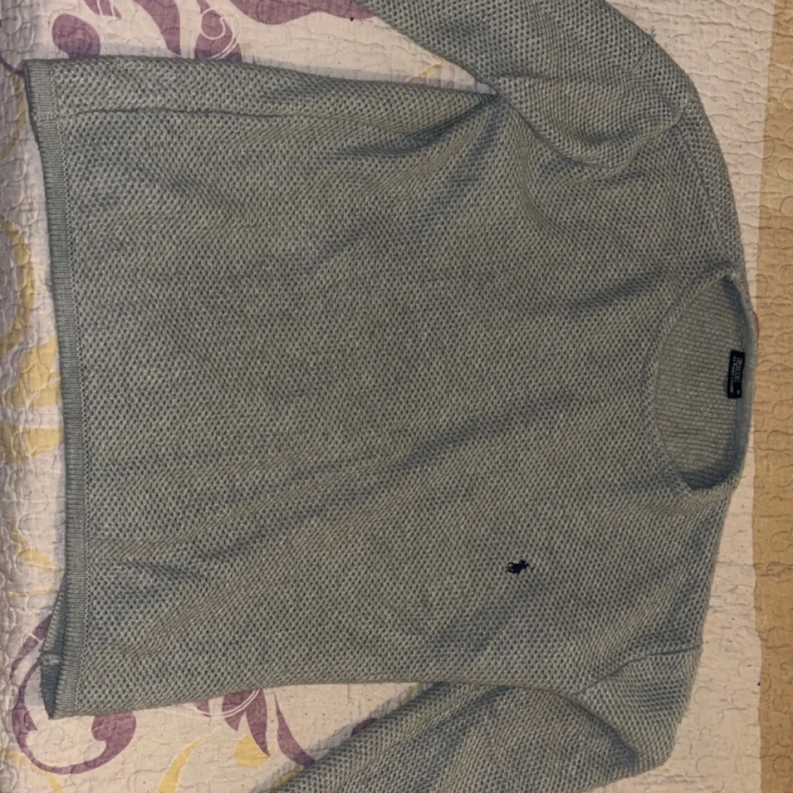 Snygg grå stickad tröja från Polo Ralph Lauren med diskret svart logga broderad på bröstet. Tröjan har rund halsringning och långa ärmar, perfekt för lager-på-lager-stil under kyliga dagar.