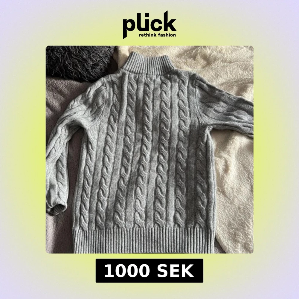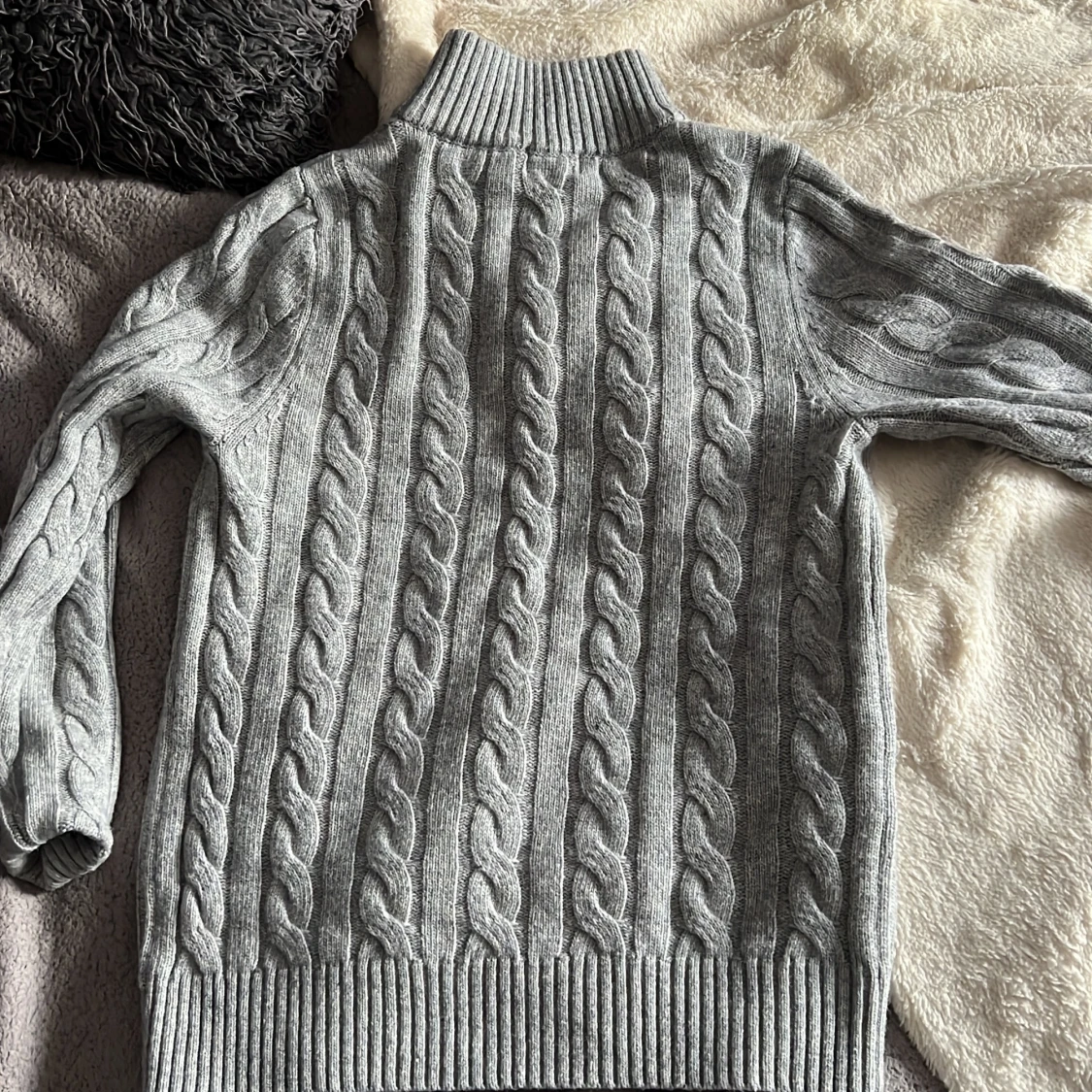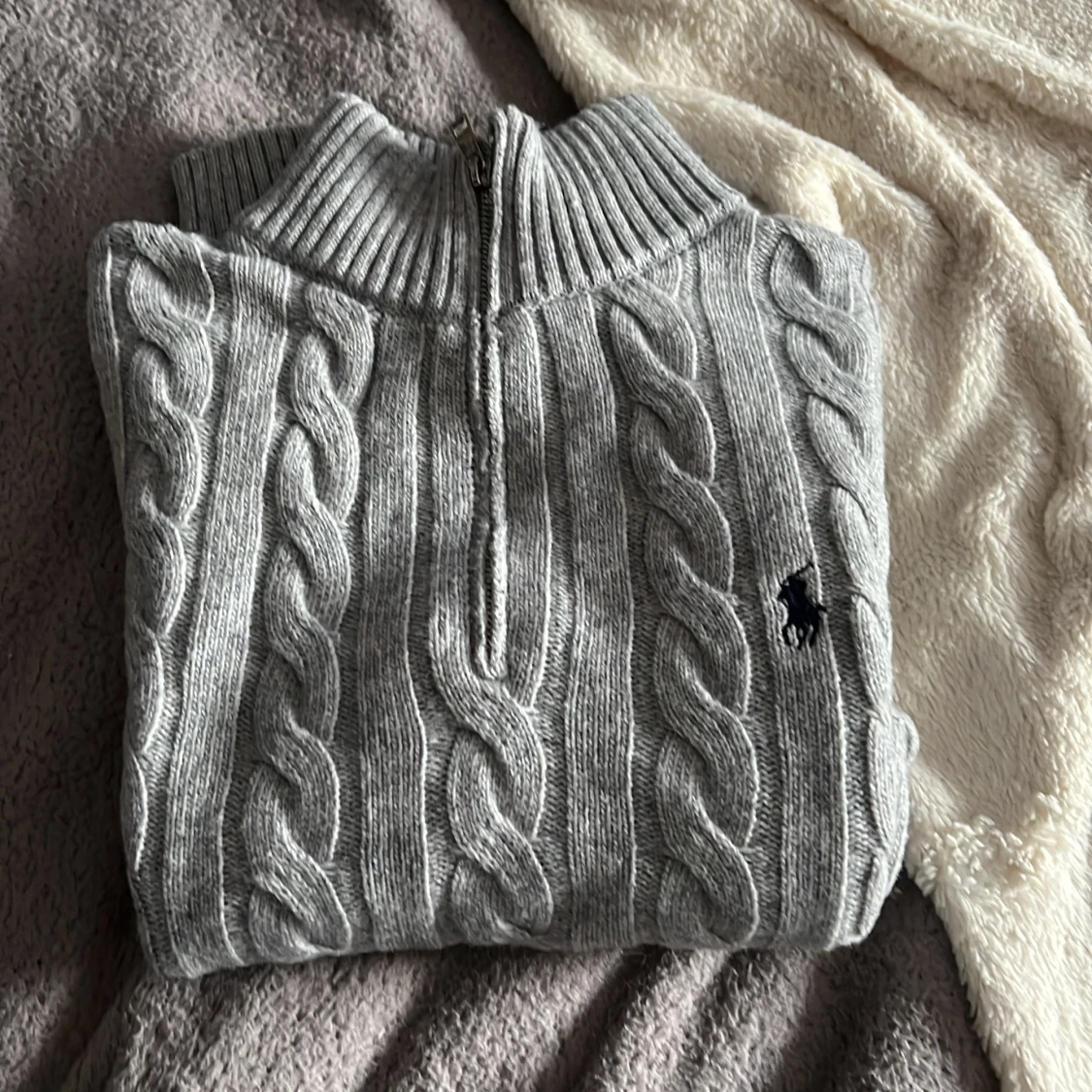 Säljer en stilren grå stickad tröja från Ralph Lauren med kabelstickat mönster och dragkedja vid halsen. Tröjan har en hög krage och långa ärmar, perfekt för kyliga dagar. En klassisk och tidlös design som passar till mycket.