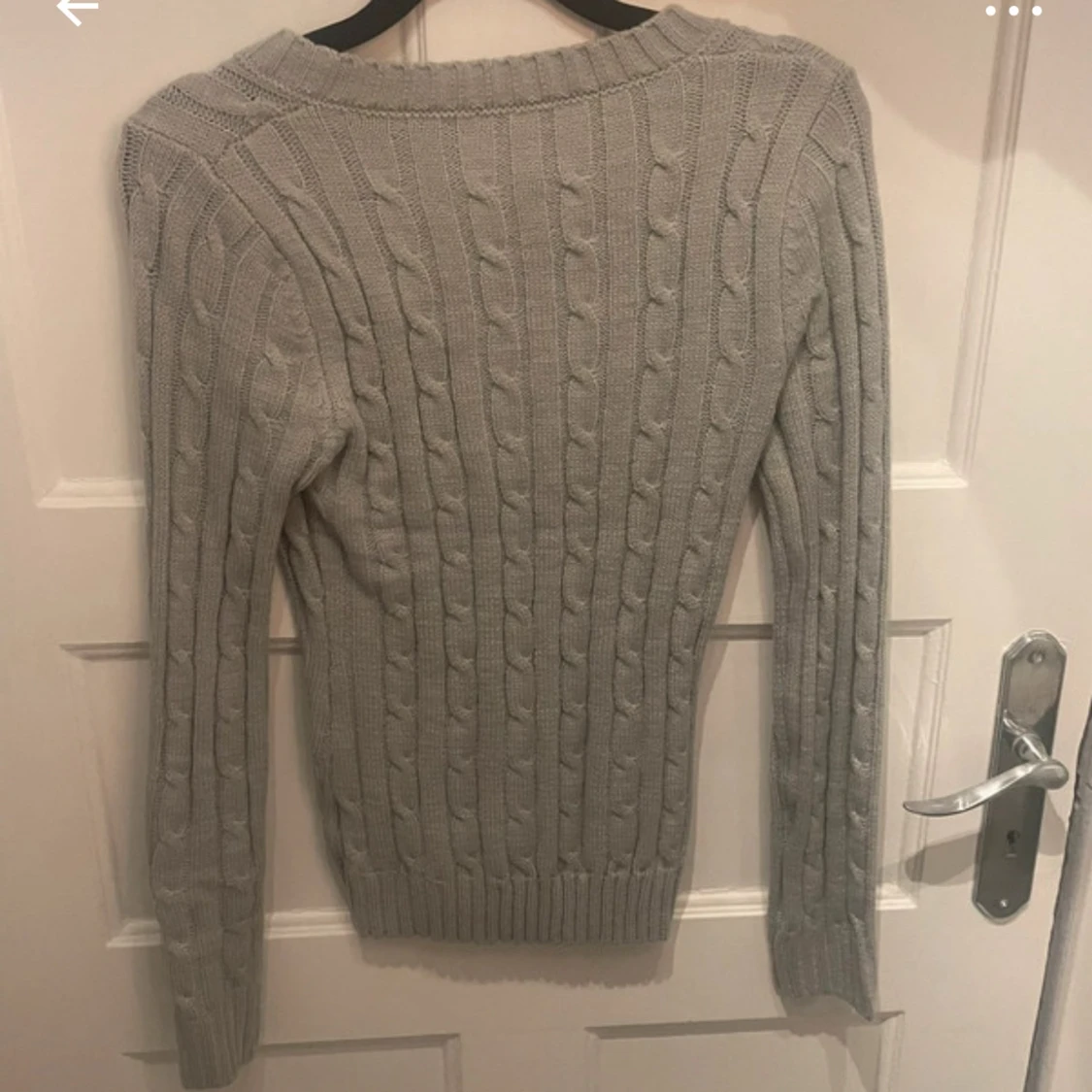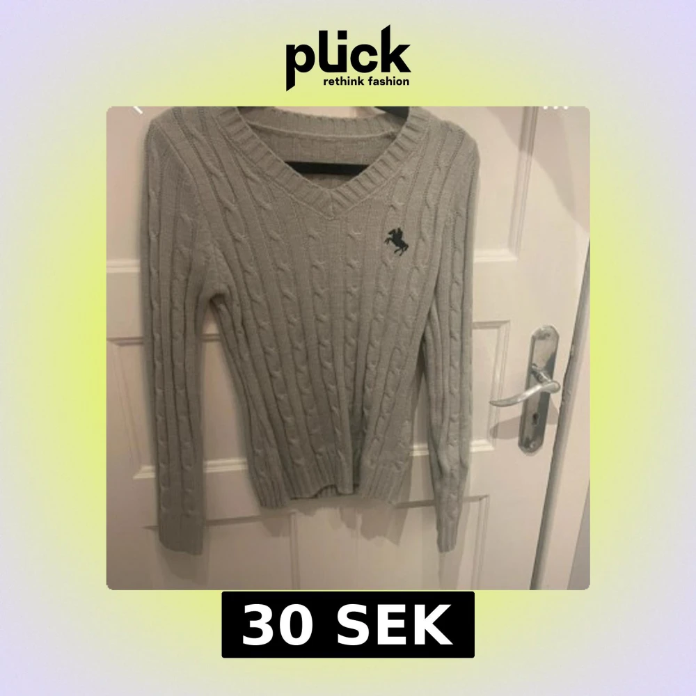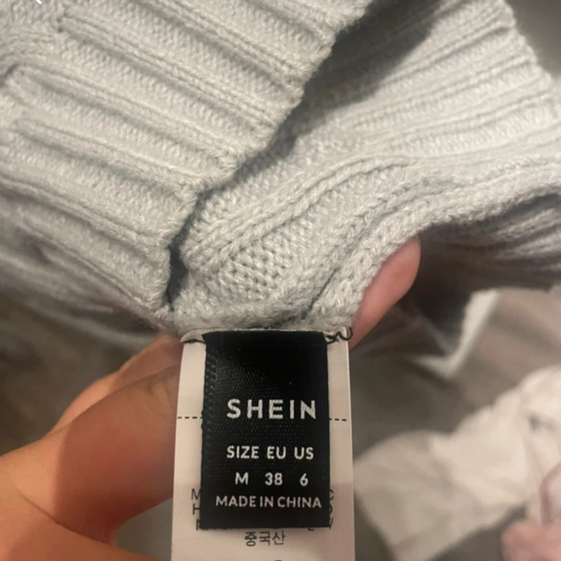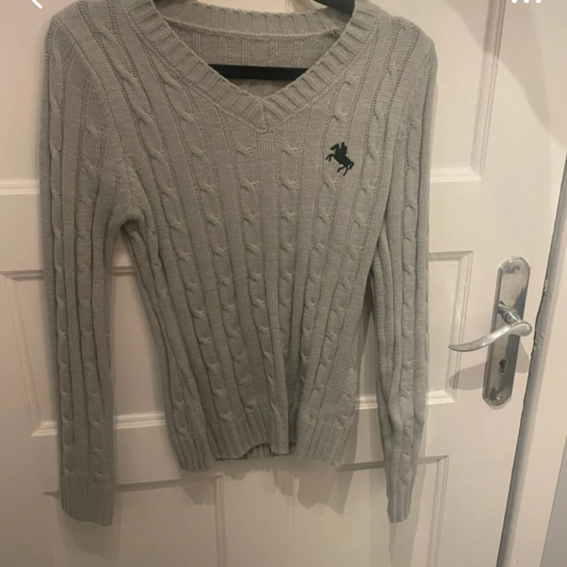 Snygg grå stickad tröja från Shein i storlek M. Tröjan har ett klassiskt kabelstickat mönster, v-ringad hals och långärmade ärmar. På bröstet finns en liten svart broderad häst. Perfekt för dig som gillar enkel och stilren look.