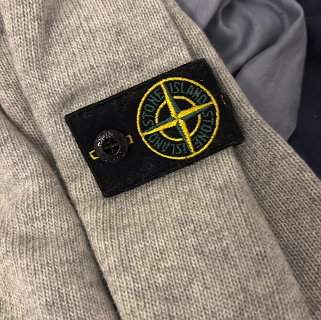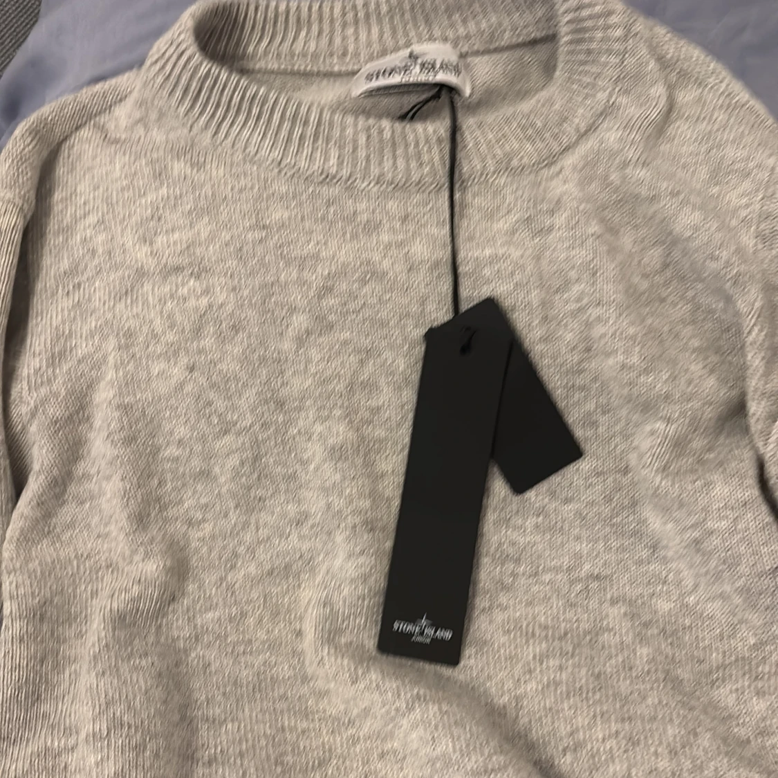 Säljer en stilren grå stickad tröja från Stone Island. Tröjan har en rund halsringning och långa ärmar med ribbade muddar. Perfekt för kyligare dagar. Märkets ikoniska logga finns på ärmen. Den är 14-16 men passar mig som är 172 och 58 kg, skulle säga att den passer från 168-175